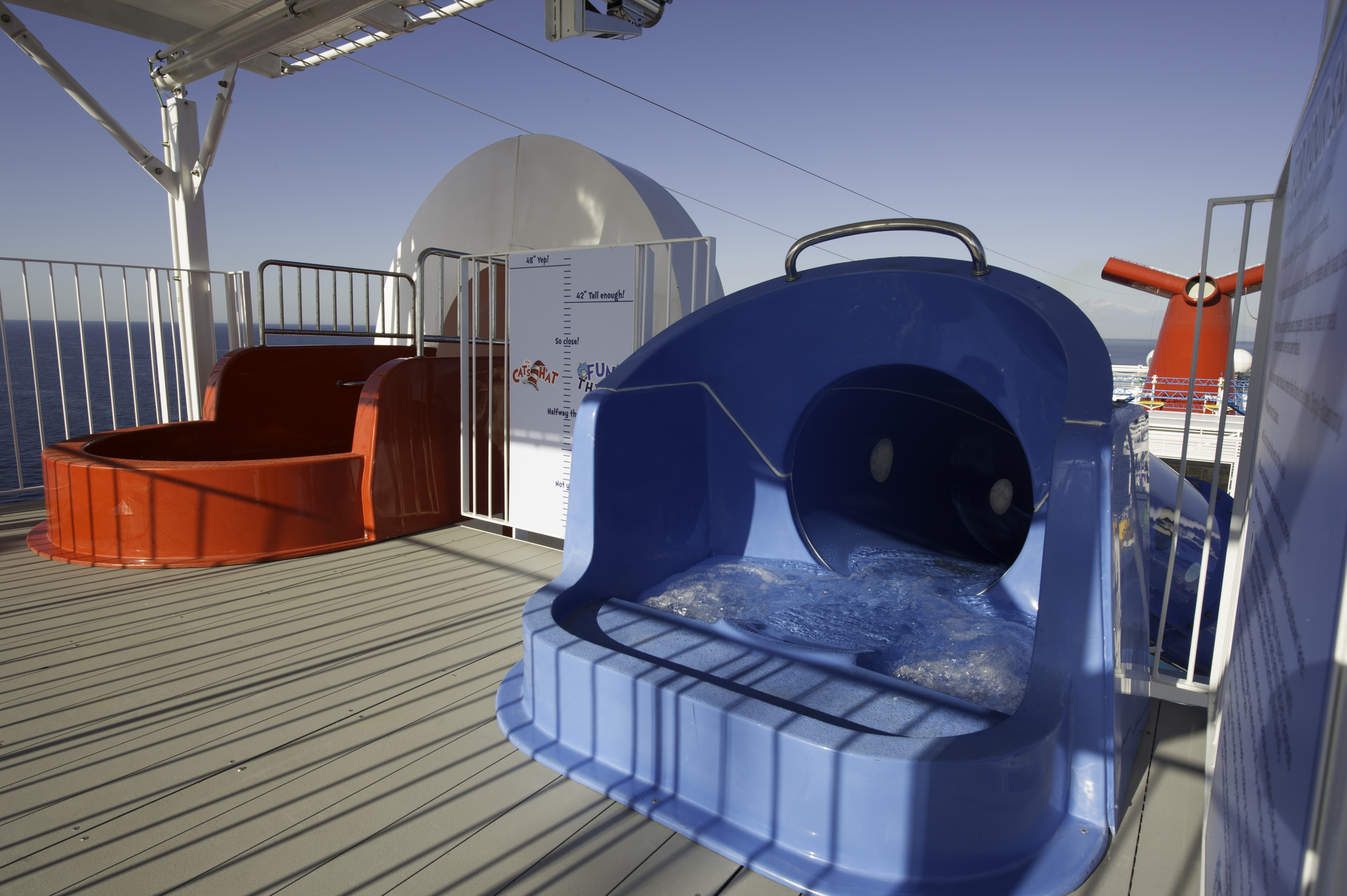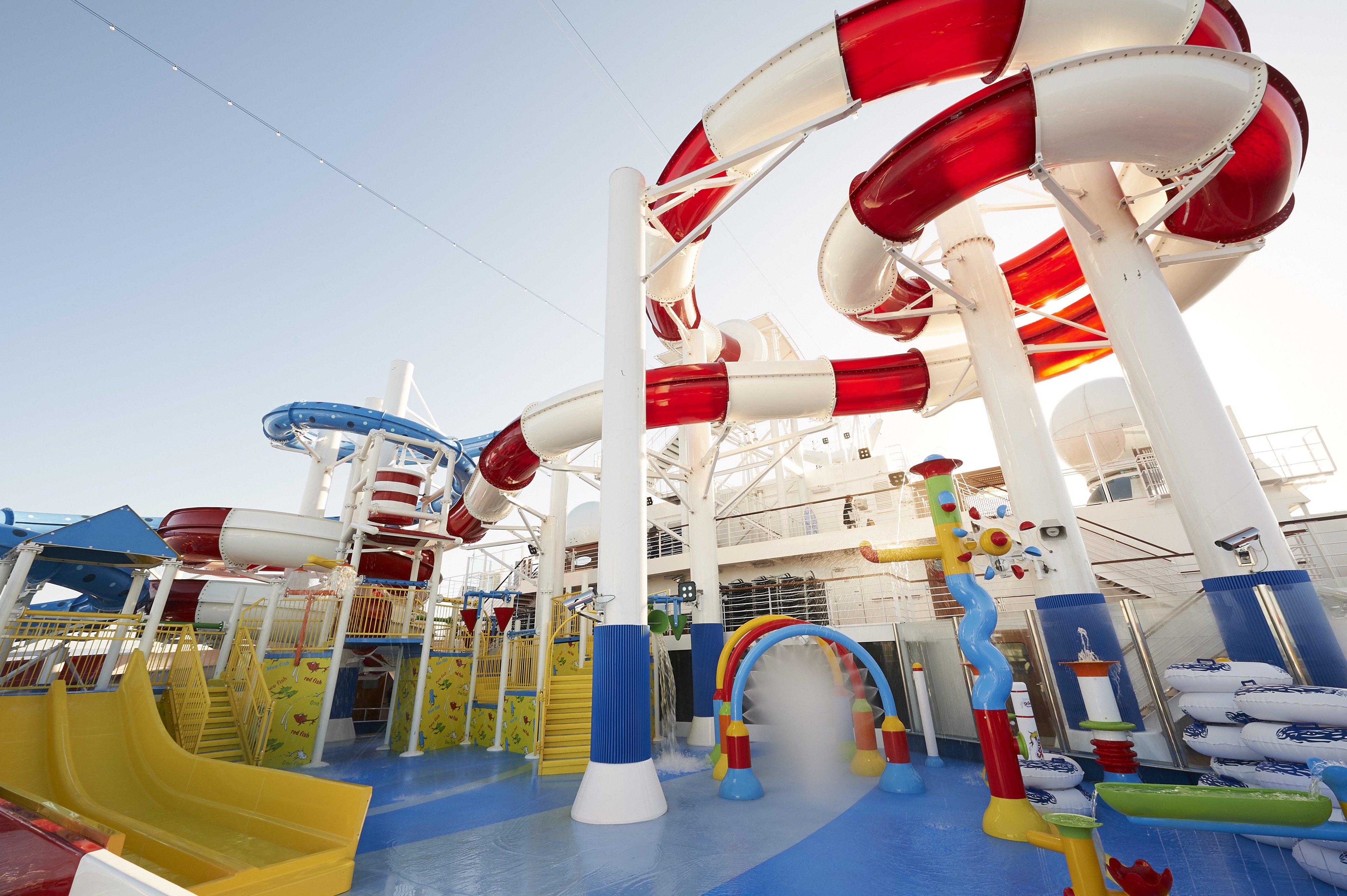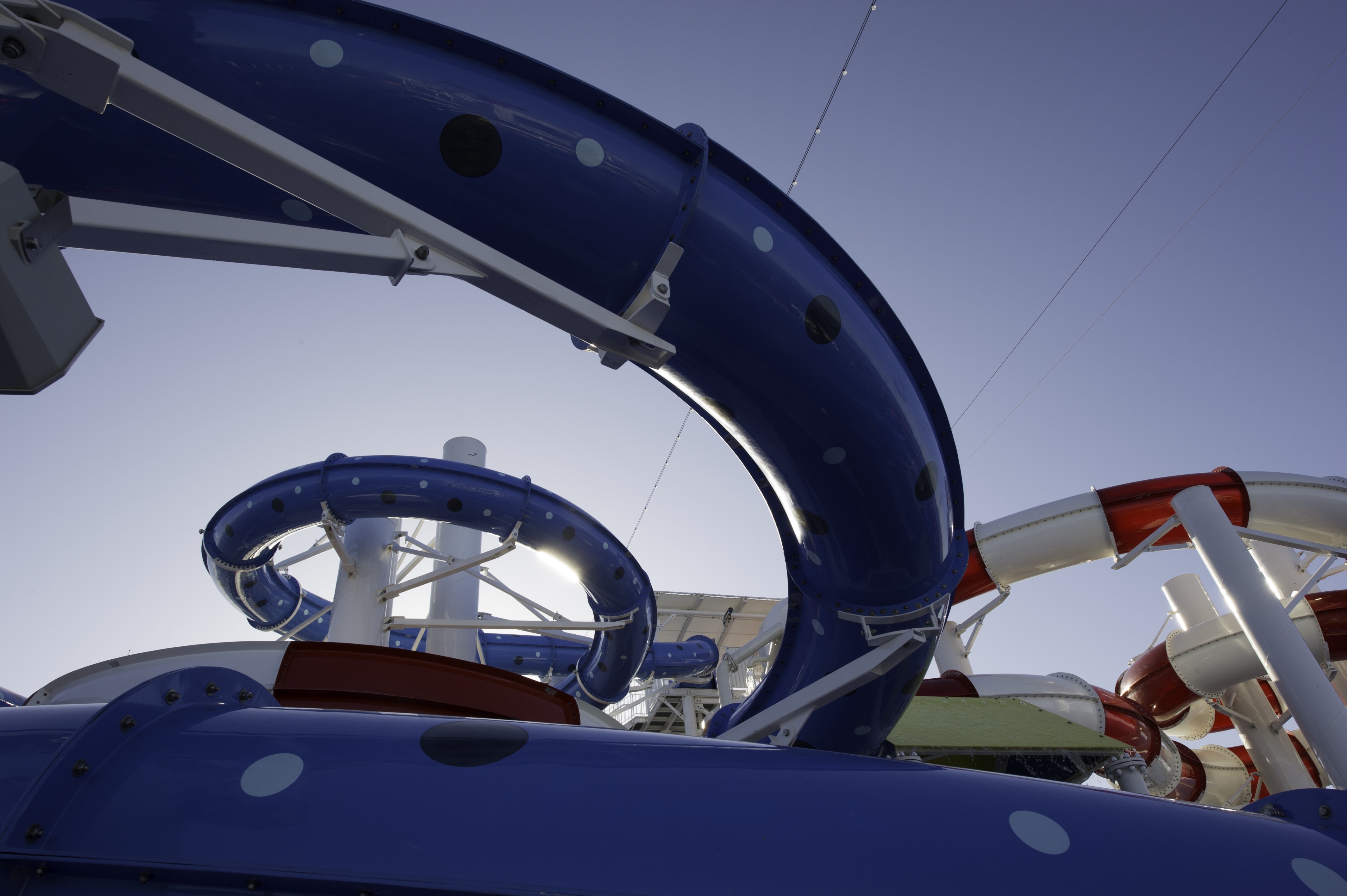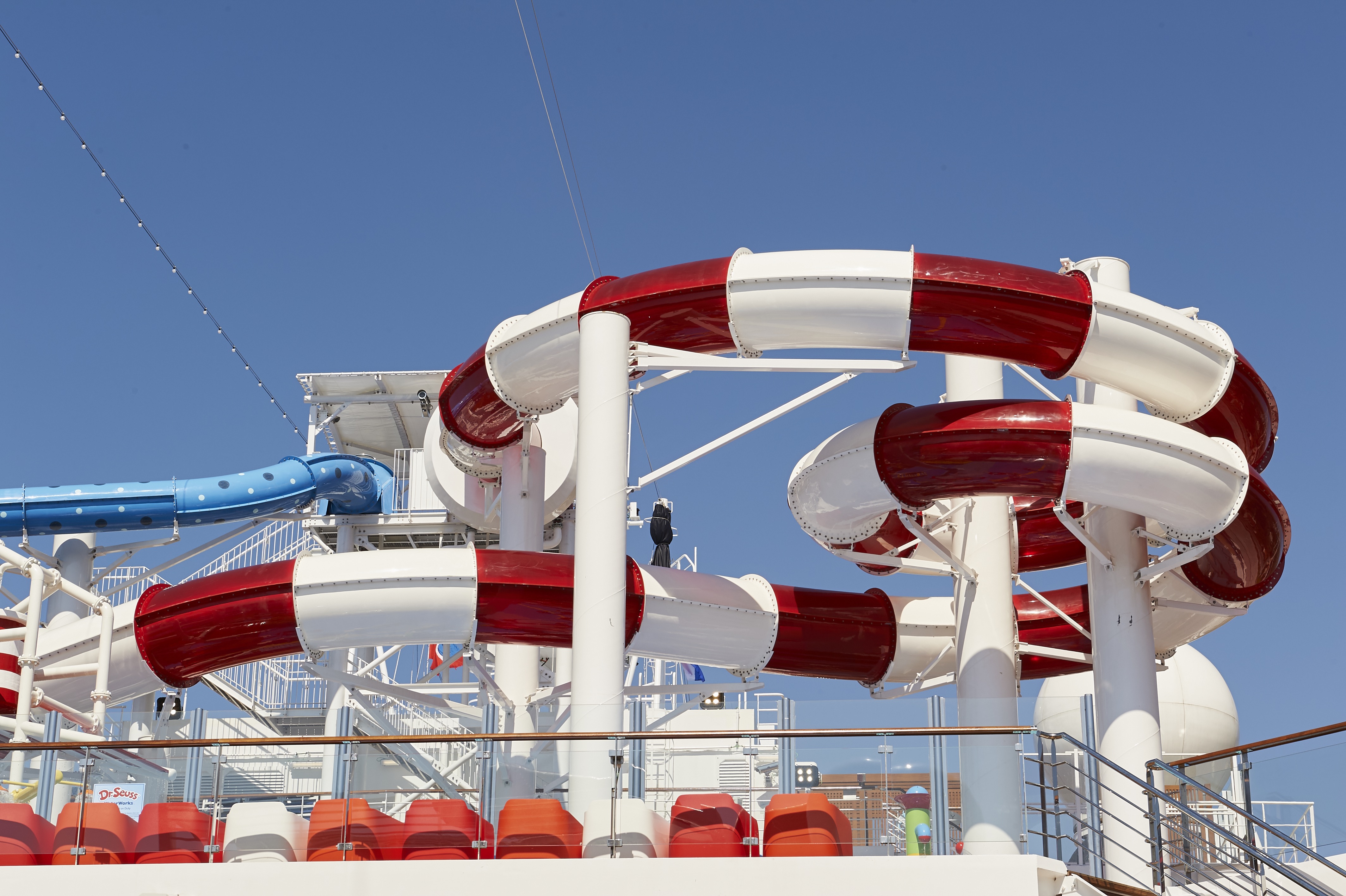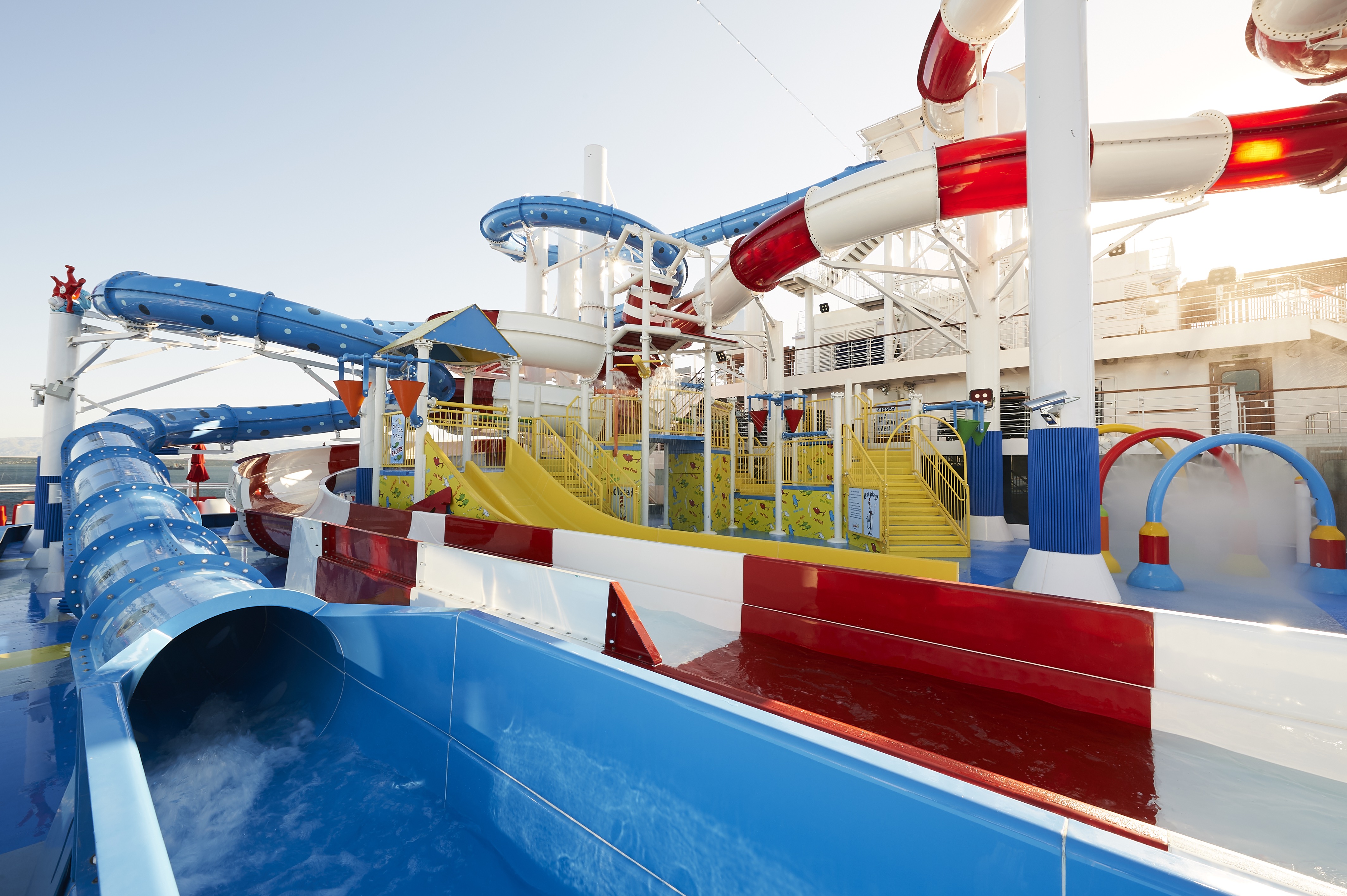 Wanna splish — and splash — the day away? Head on over to WaterWorks™, Carnival's onboard waterpark. First up, there's the Twister Waterslide™, hundreds of feet of spiralling awesomeness that starts you off high in the air and gets you down low with one of the fastest, wettest rides you'll find anywhere. Select ships have side-by-side racing slides, which make serious competition seriously fun. Wear your speed suit for Speedway Splash, which features hundreds of feet of racing action, plus special lighting effects you'll experience on the road to victory. DrainPipe™ ends with one major swirl of a finish, while PowerDrencher™ takes soaking seriously — imagine the biggest bucket of water you've ever seen, raining down on you from above. And this isn't just kids' stuff — the young at heart are encouraged to zoom and splash around too! (WaterWorks configurations vary by ship.)