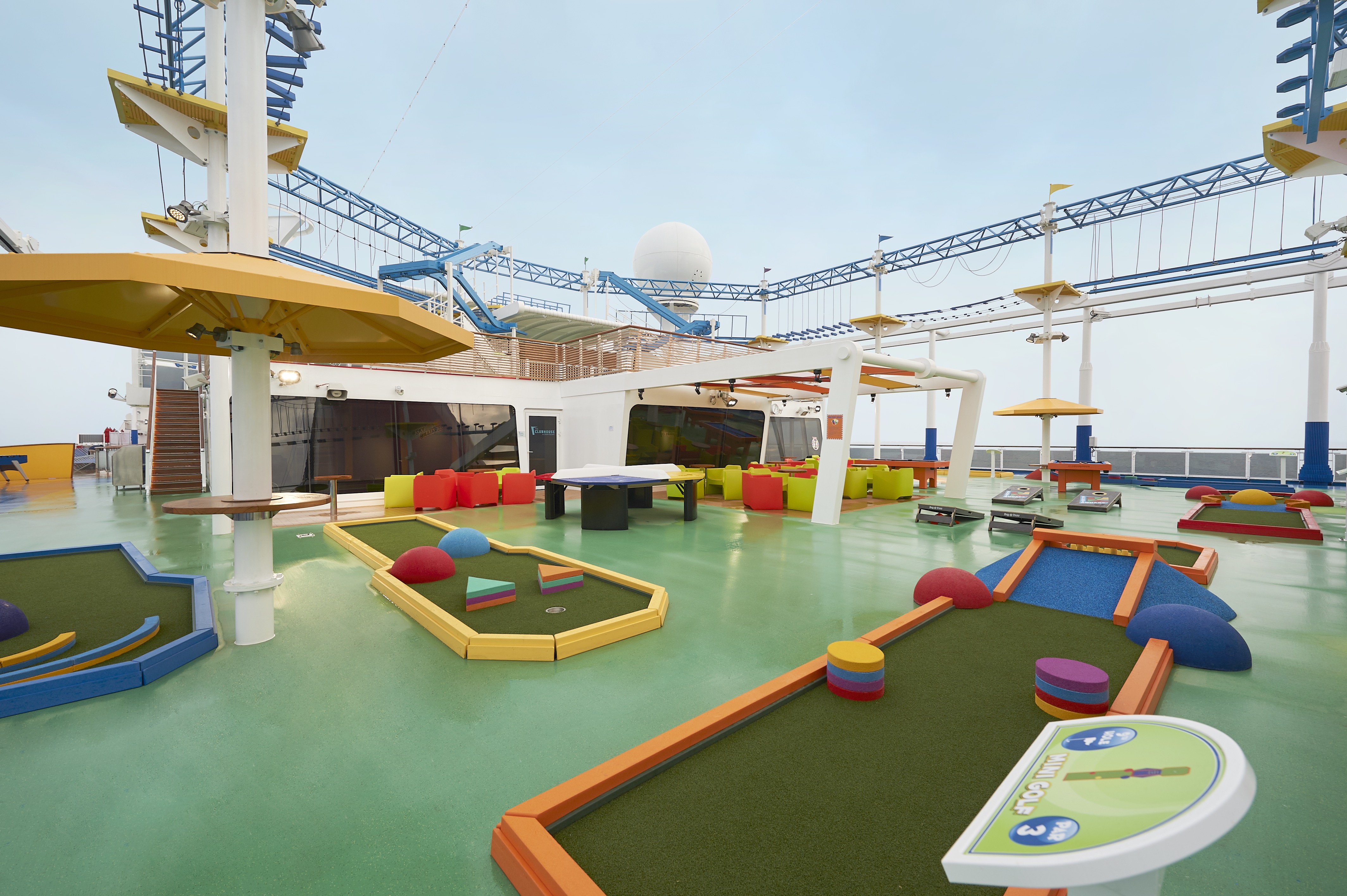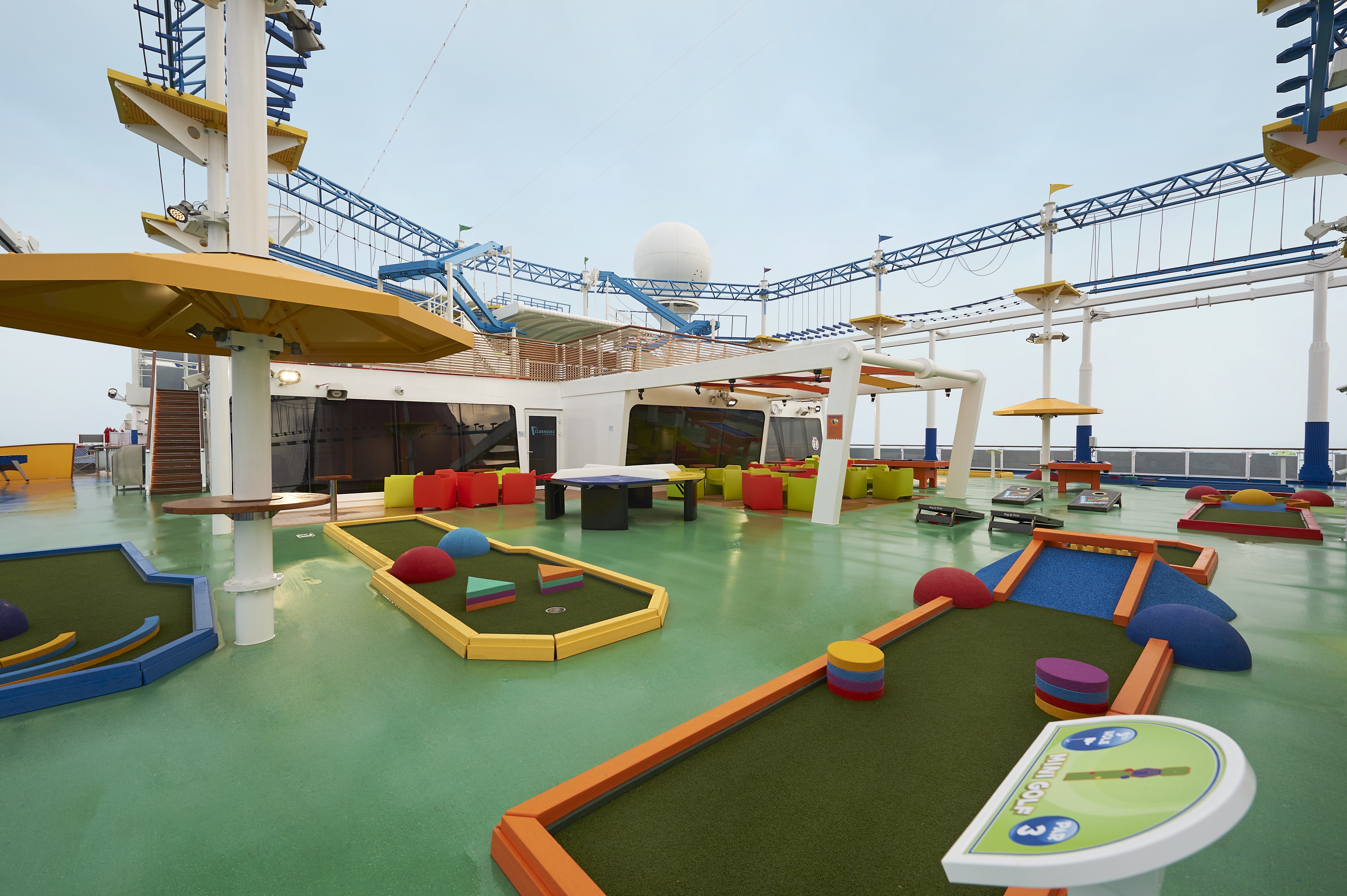 Ah, imagine a perfect day out on the links, the golfer's zen of the ball, the hole and nothing in between but well-manicured fairway... plus one cactus, a treasure chest... and wait, is that a windmill in the way? Just who designed this course anyway? Whoever it was, they had one thing in mind — maximum fun for mini-golfers, big and small! That's precisely why you'll find a course on every Carnival® ship, where you can hit the holes and take in everything you’d expect, like the sights and the sounds... plus the seagulls.