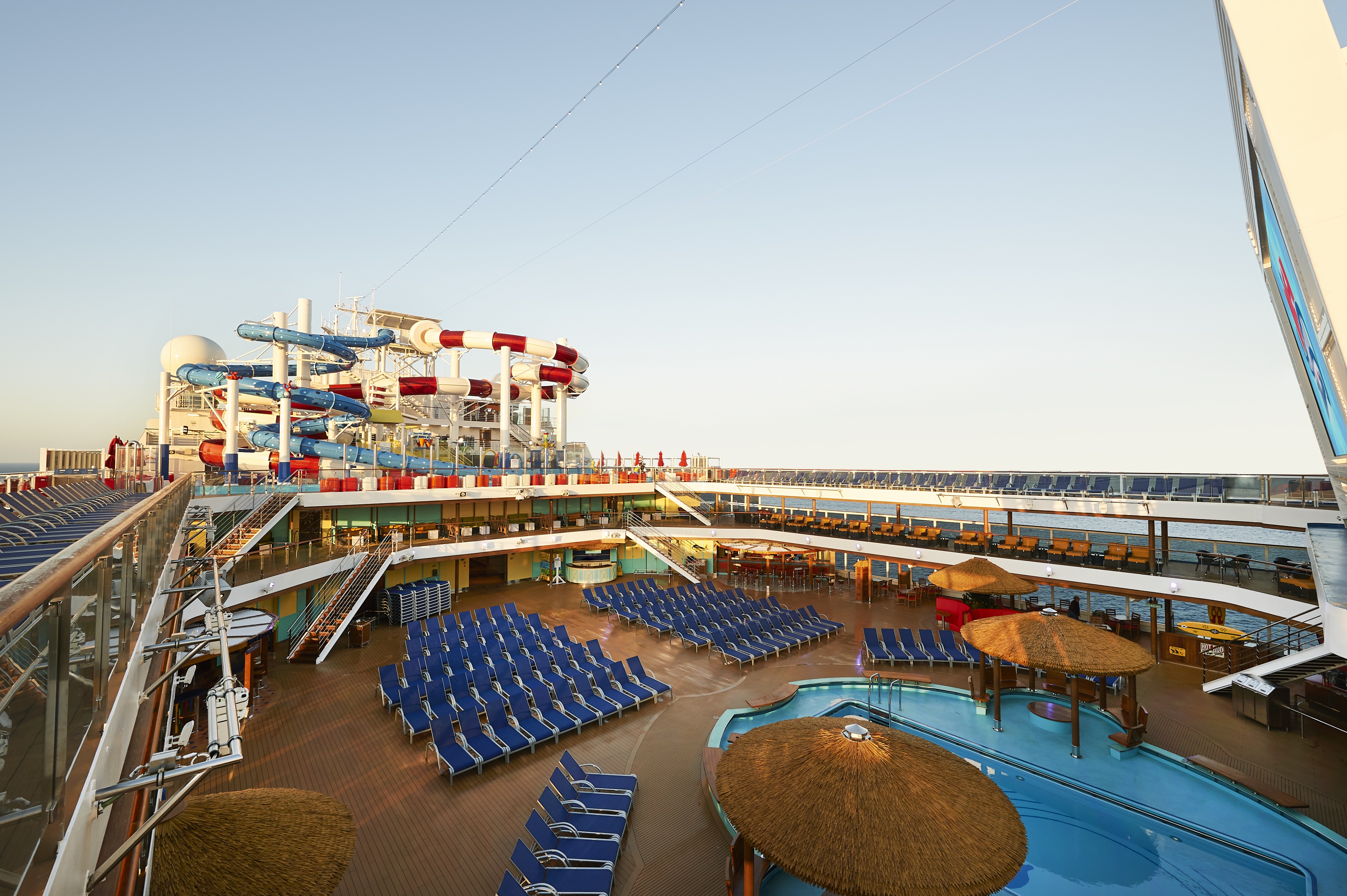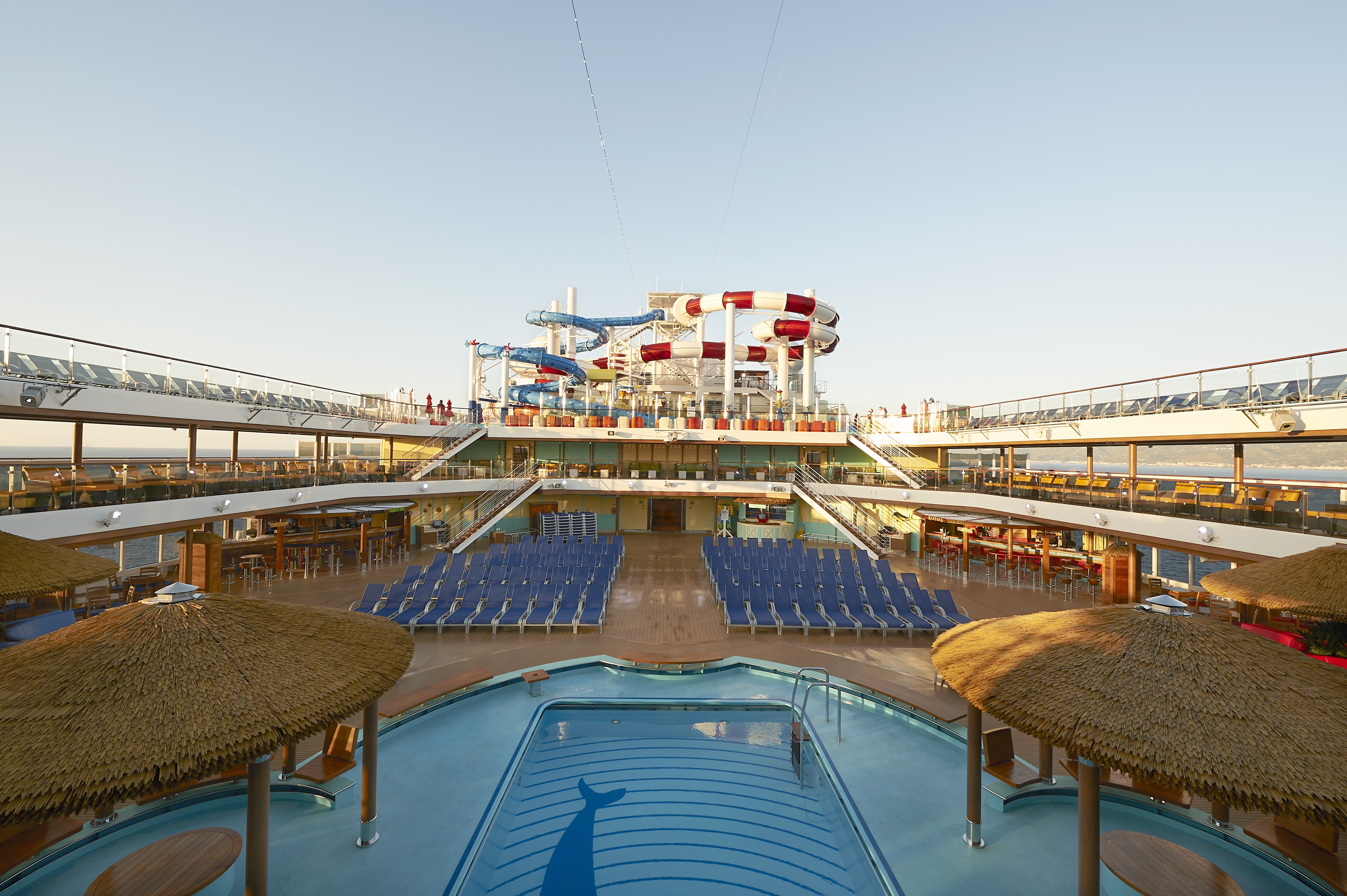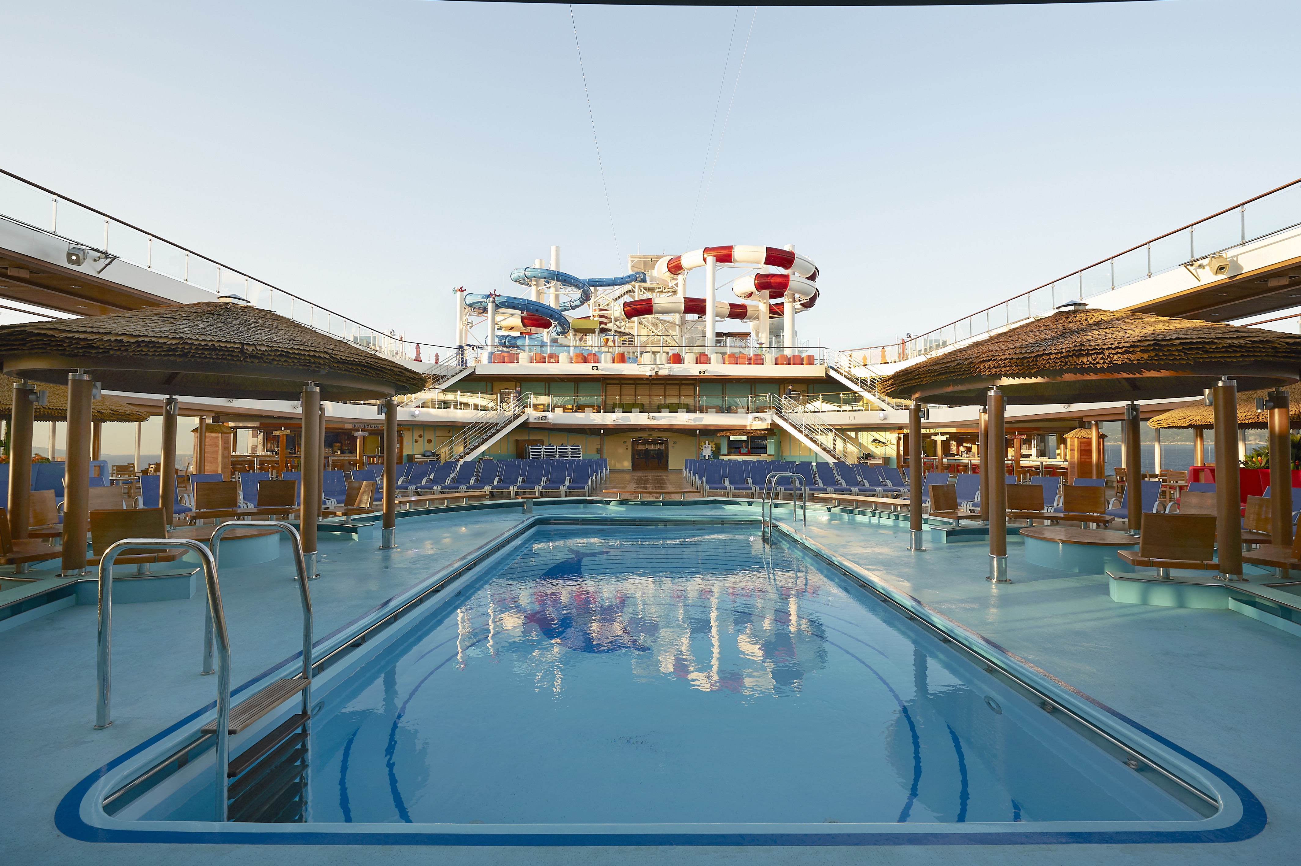 POOL DAY! Whether today's the day for a bit of a dip, a dash of splash or even some swimming — or just a serious poolside lounging session — your Carnival cruise has just the pool for you. In fact, pools are so important to a great cruise that we designed many of our ships to have two of them. At an aft pool you'll catch a breeze, plus a sea view featuring the ship's wake, while midship pools have a grand view of a different kind: the big screen's right there for the viewing. And no matter which you find yourself chilling in, the sunbeams are yours for the soaking.