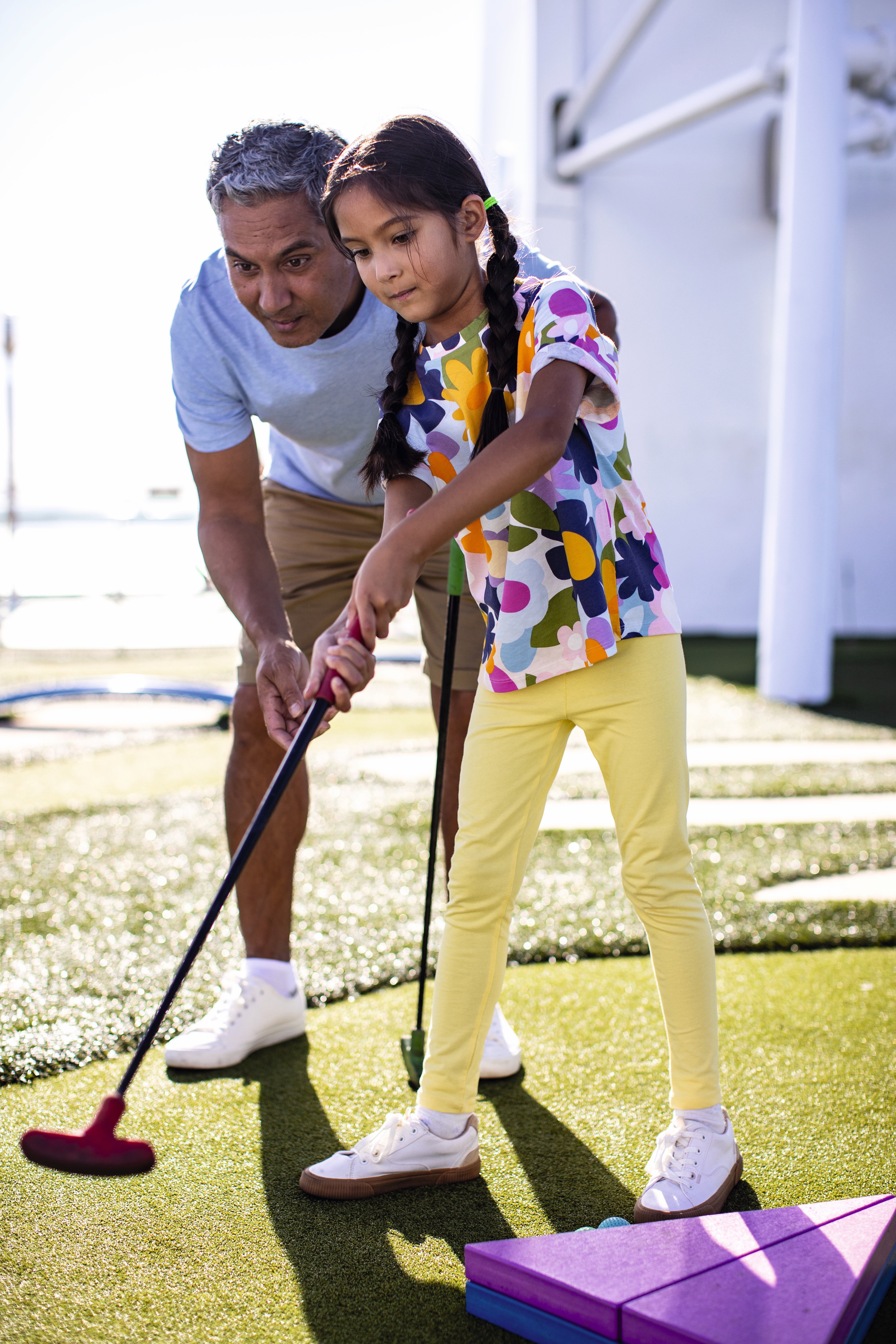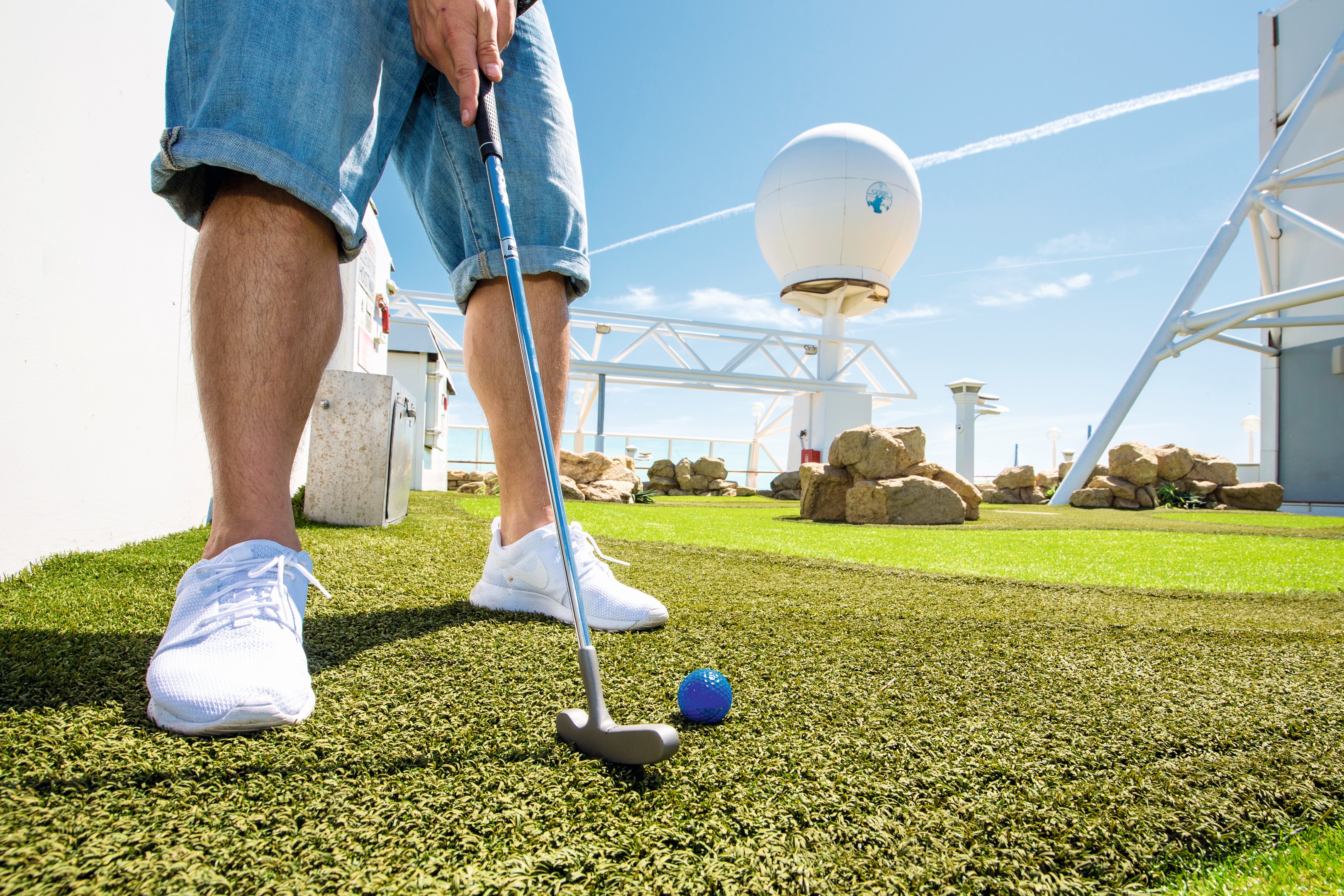 The ship’s open-air pool comes with the bonus of built-in whirlpools. You’ll find a second pool indoors, plus a slew of treatment cabins at the Oceans Gym and Spa. If you want to up the pace, head out to the rock climbing wall – a Marella Cruises first – or practice your putt on the minigolf green.
