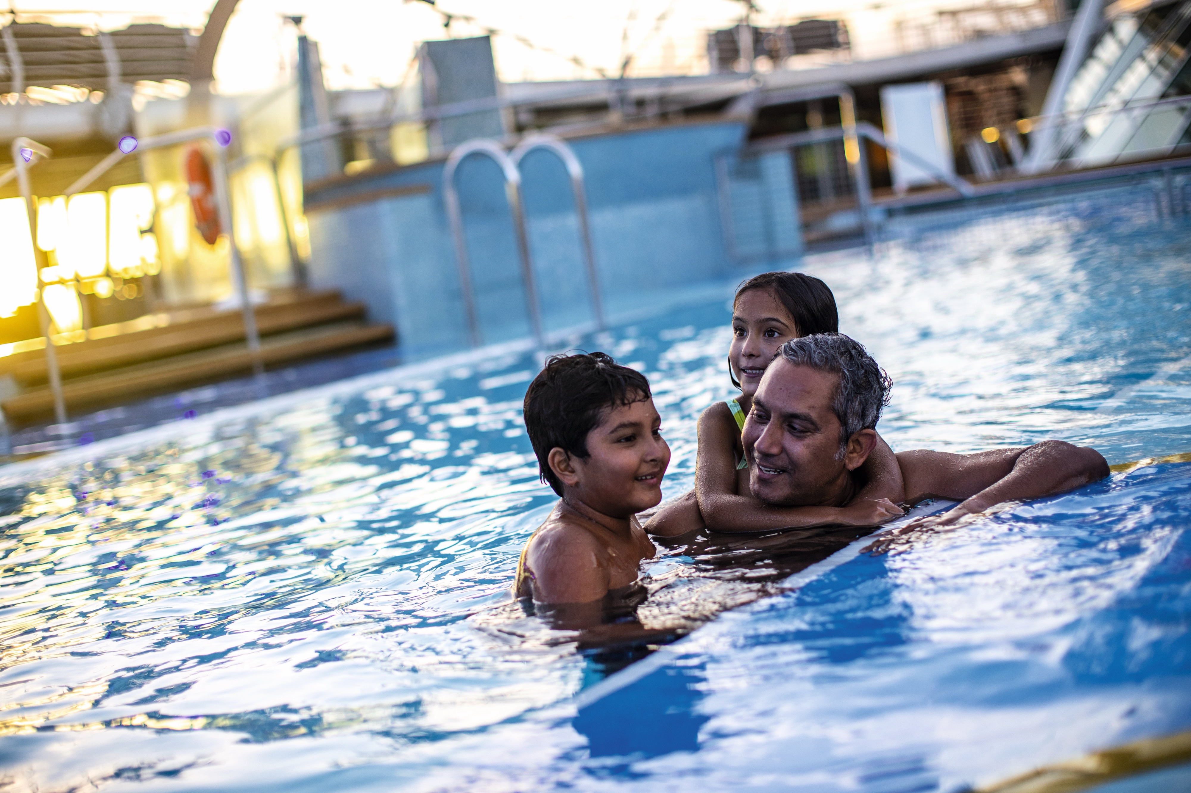 An open-air pool for all the family. Loungers are lined up along the water's edge, while music and quizzes keep the atmosphere up.