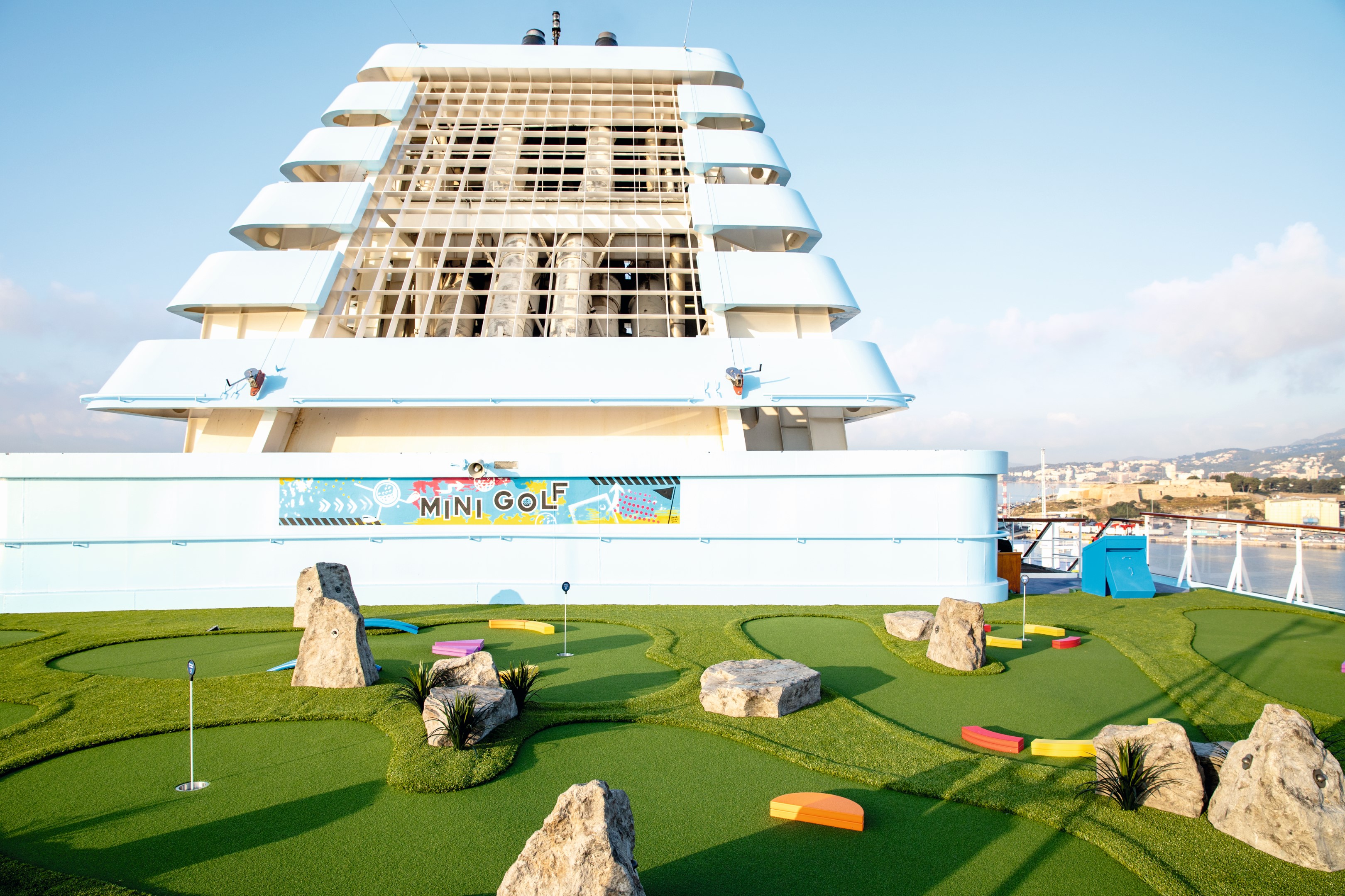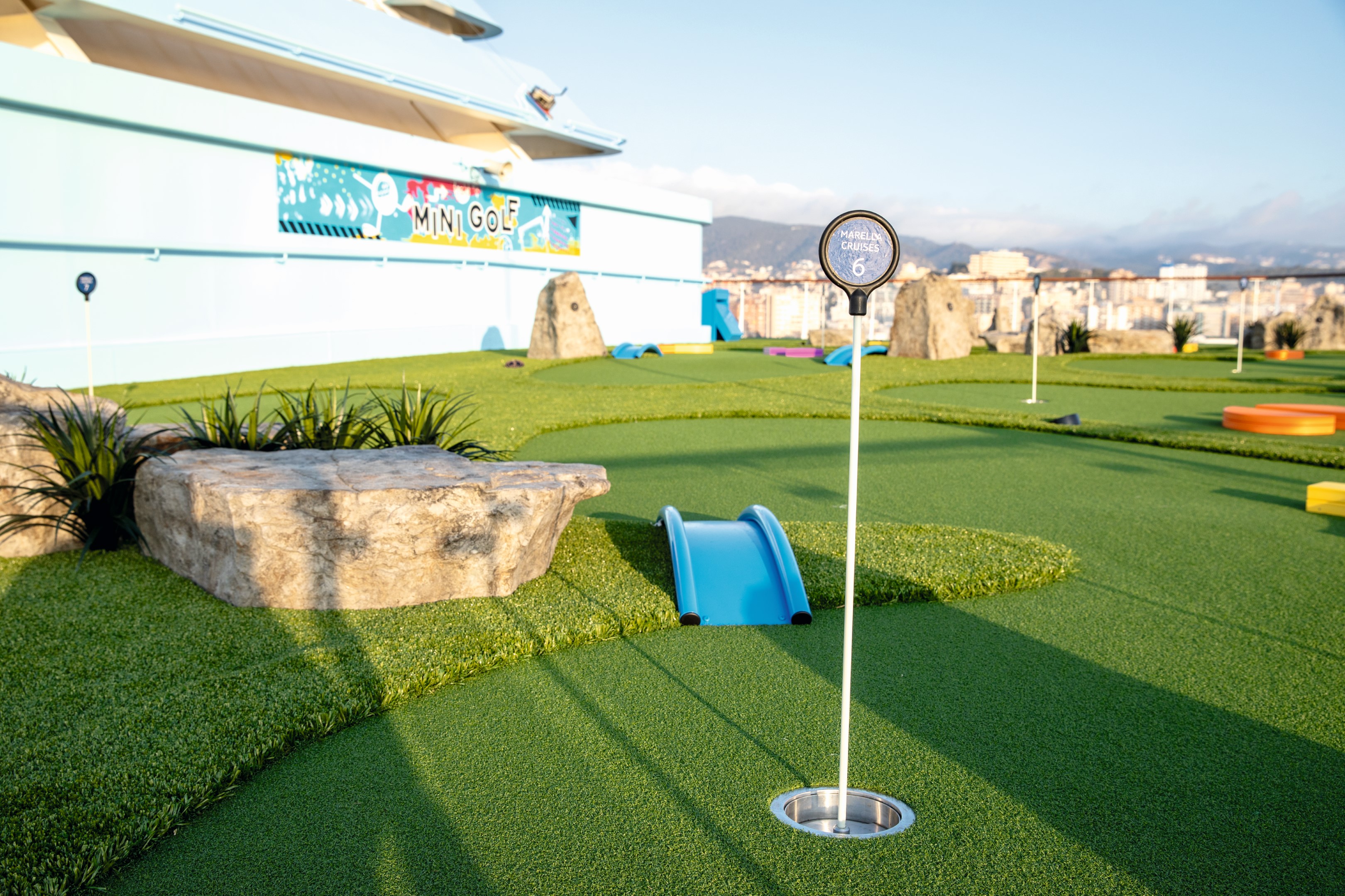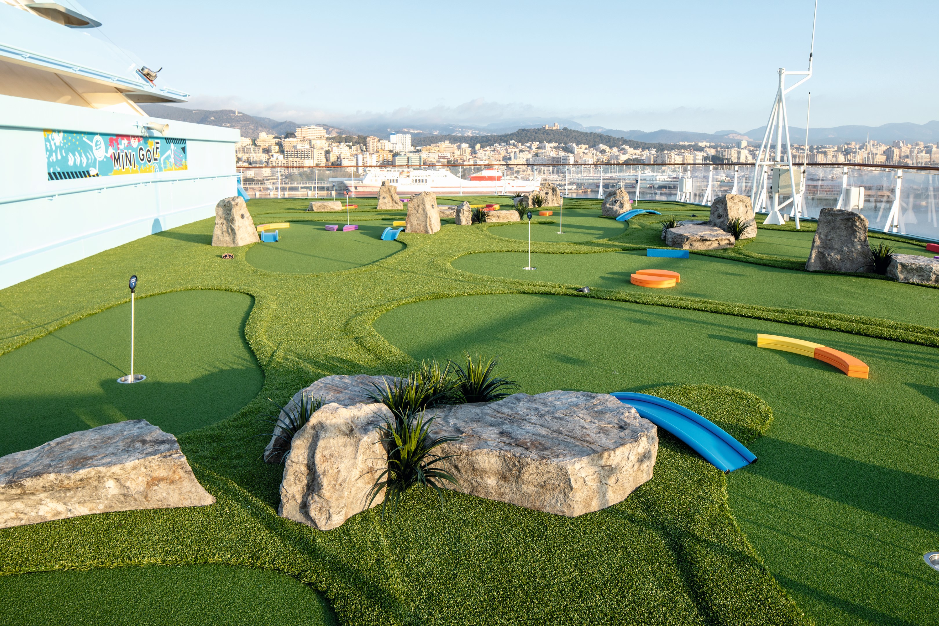 Couples can practice putting on this nine-hole minigolf green. It’s right at the top of the ship, so it comes with great sea views.