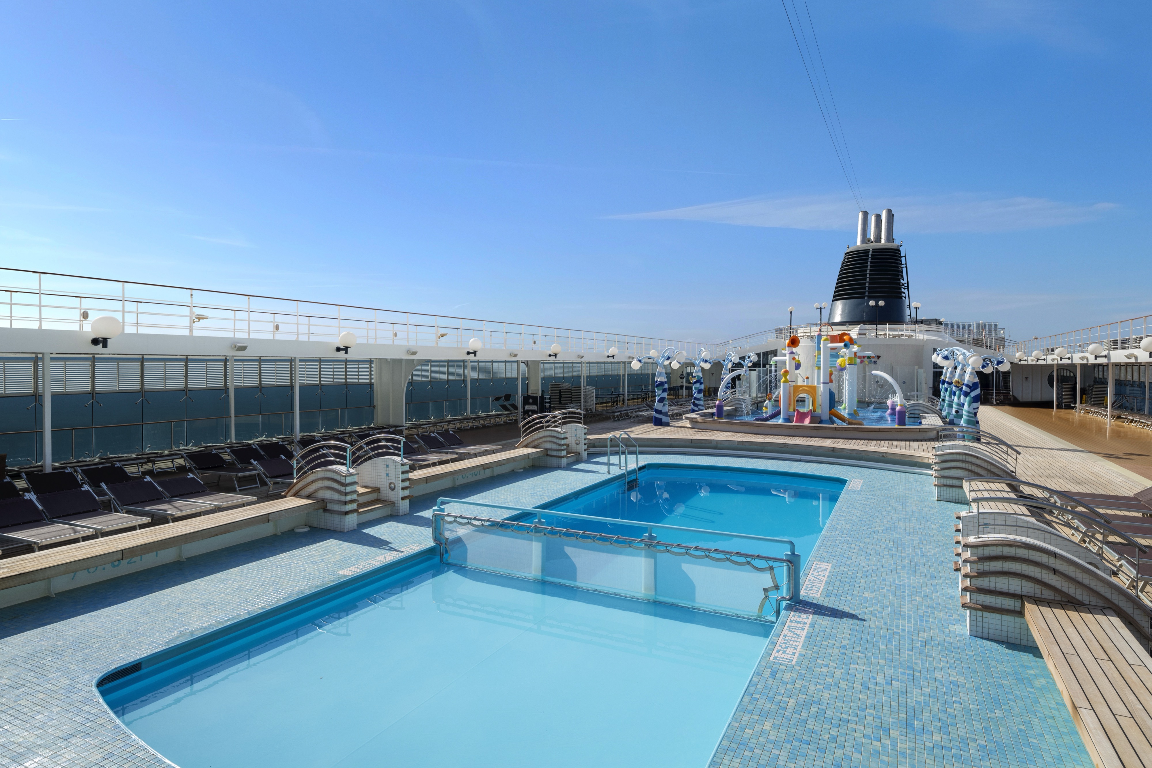 Pool area with separate children's Spray Park. Located on Deck Eleven.