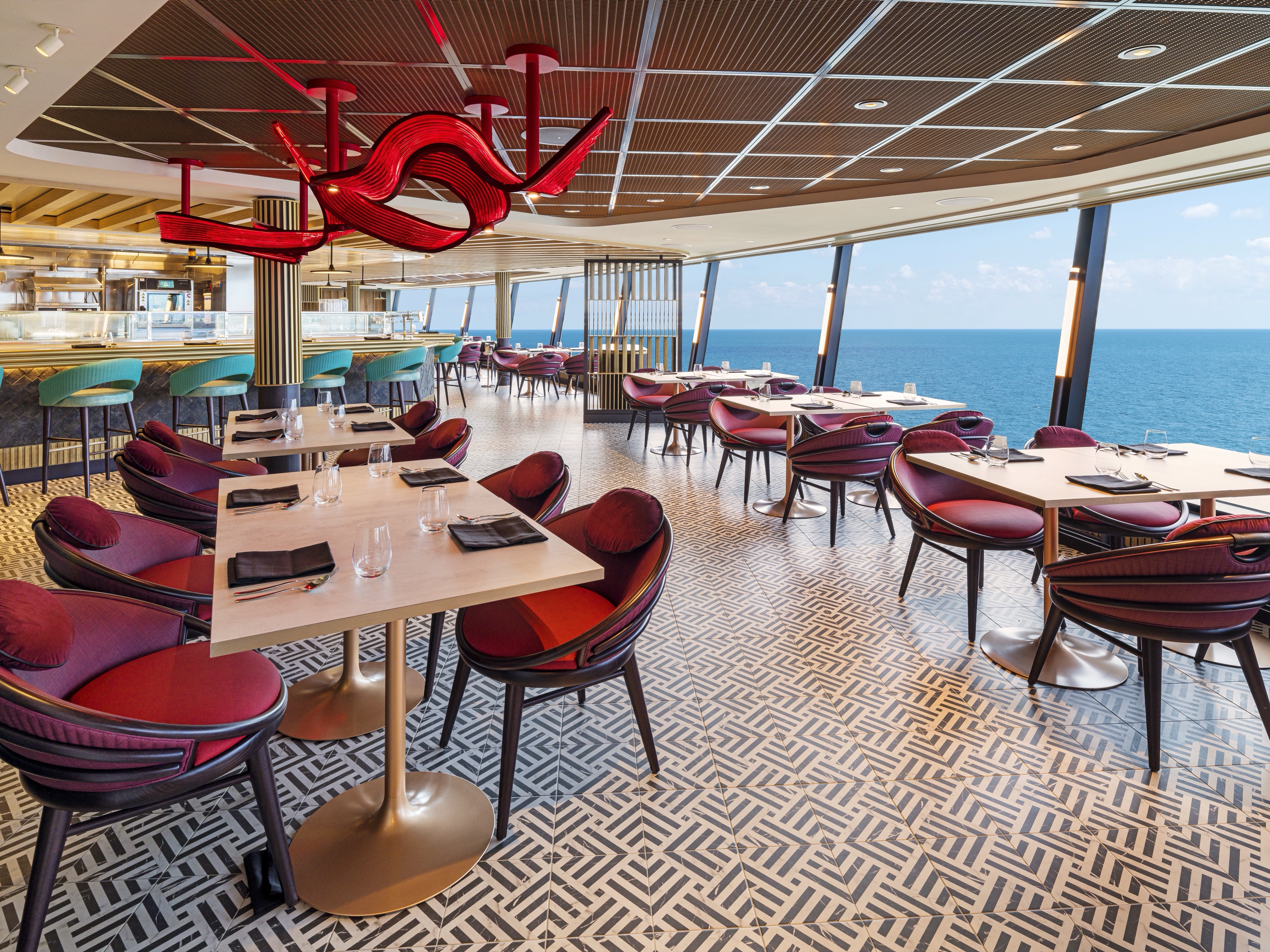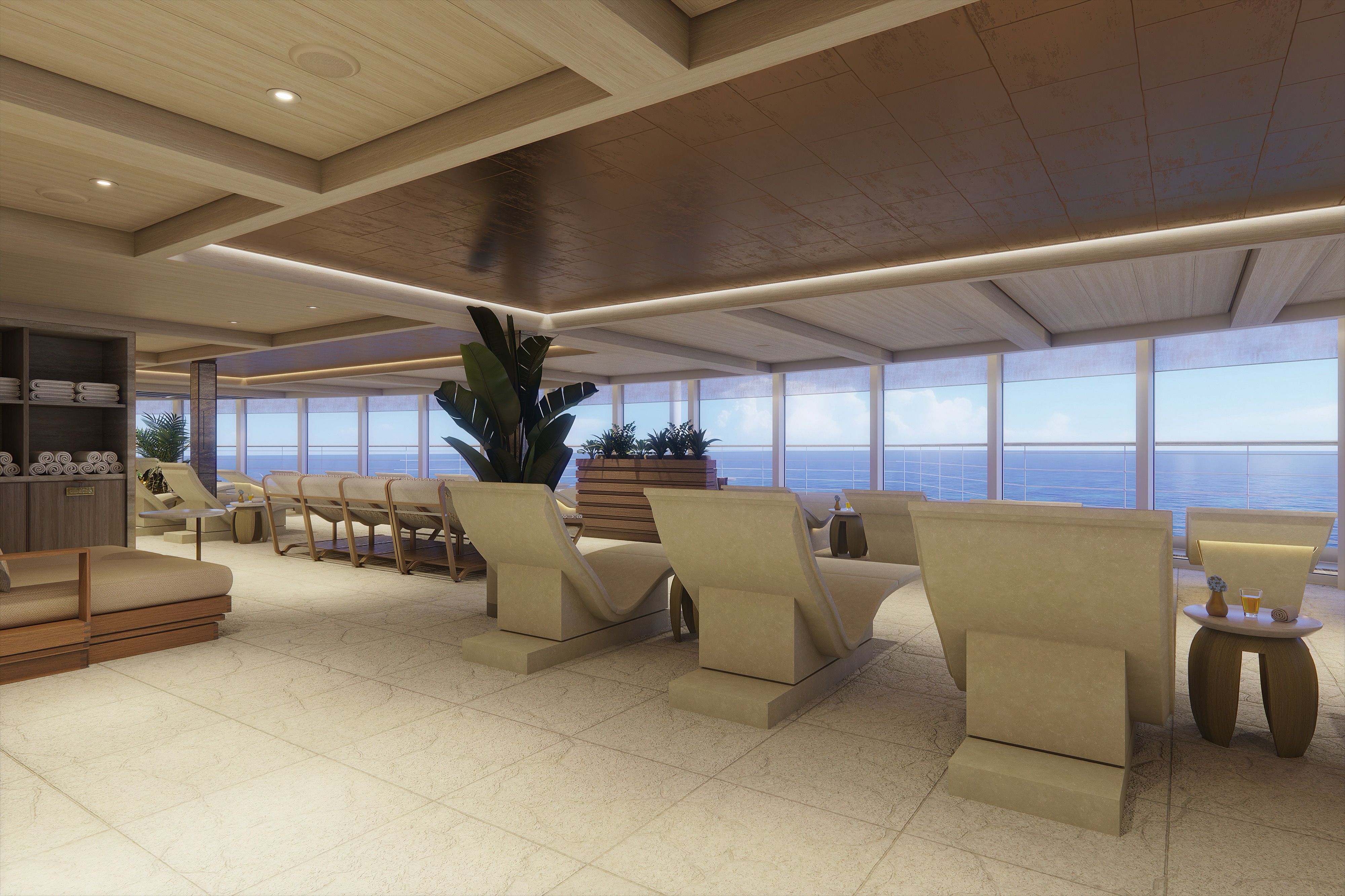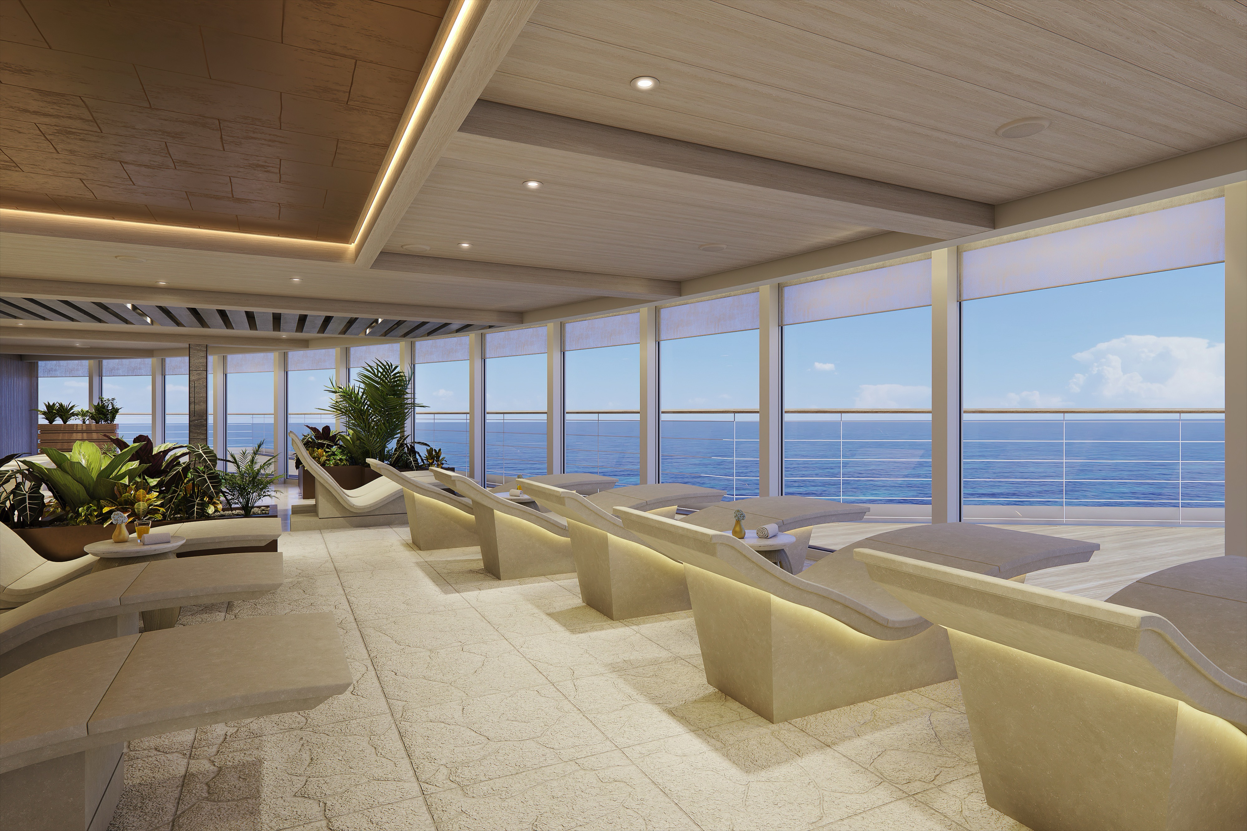 Designed to blend both indoor and outdoor experiences with stunning views of the ocean through grandiose floor-to-ceiling windows for panoramic views from the ship’s bow.