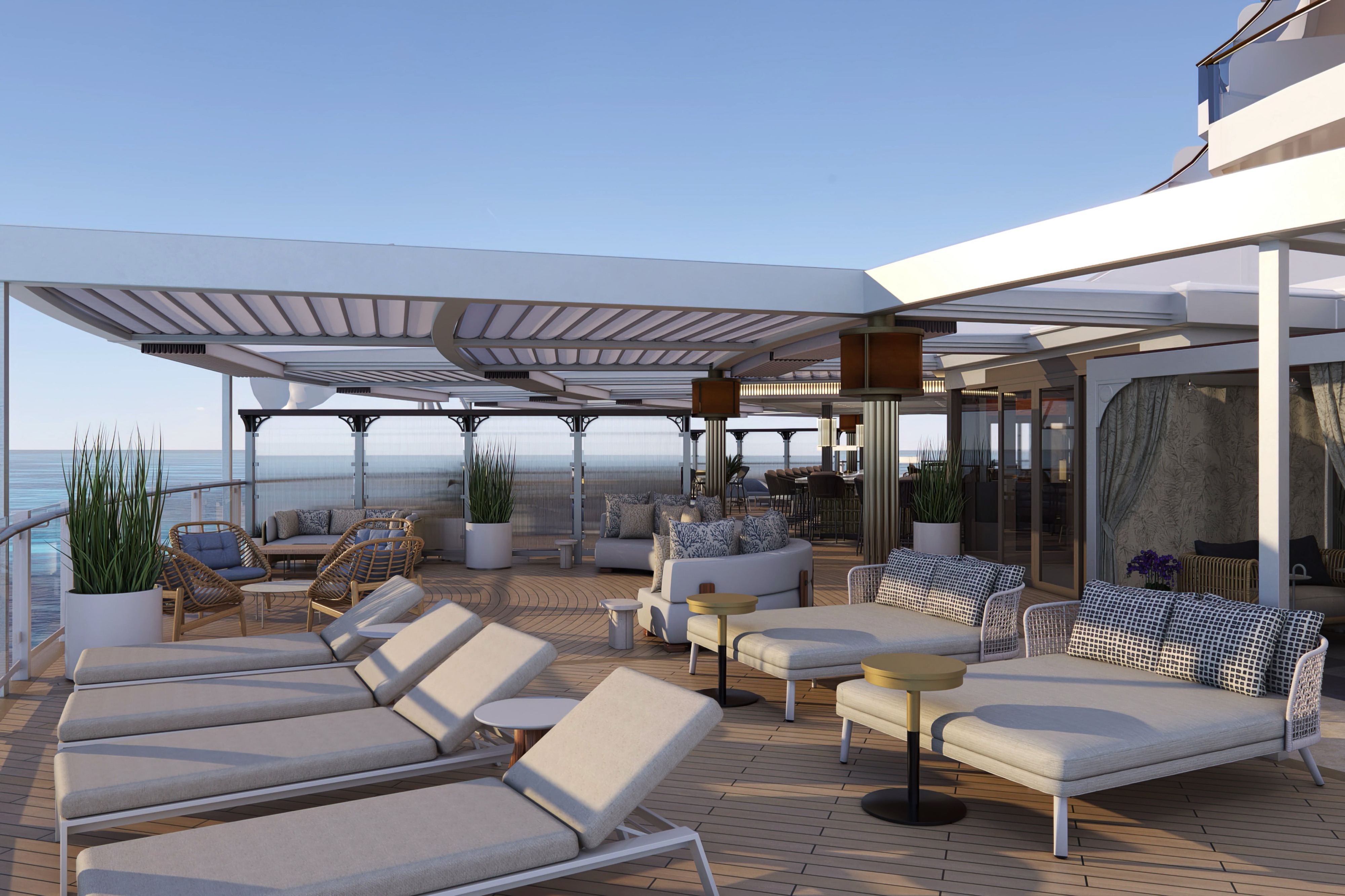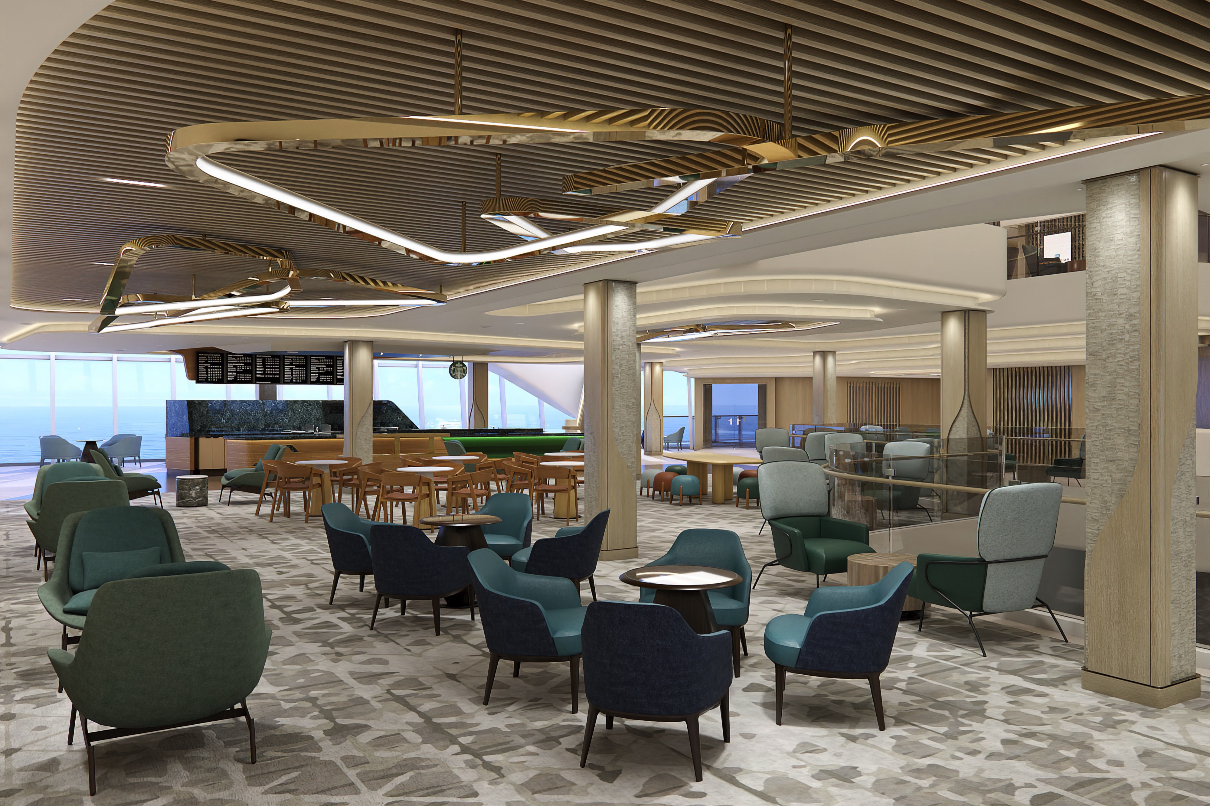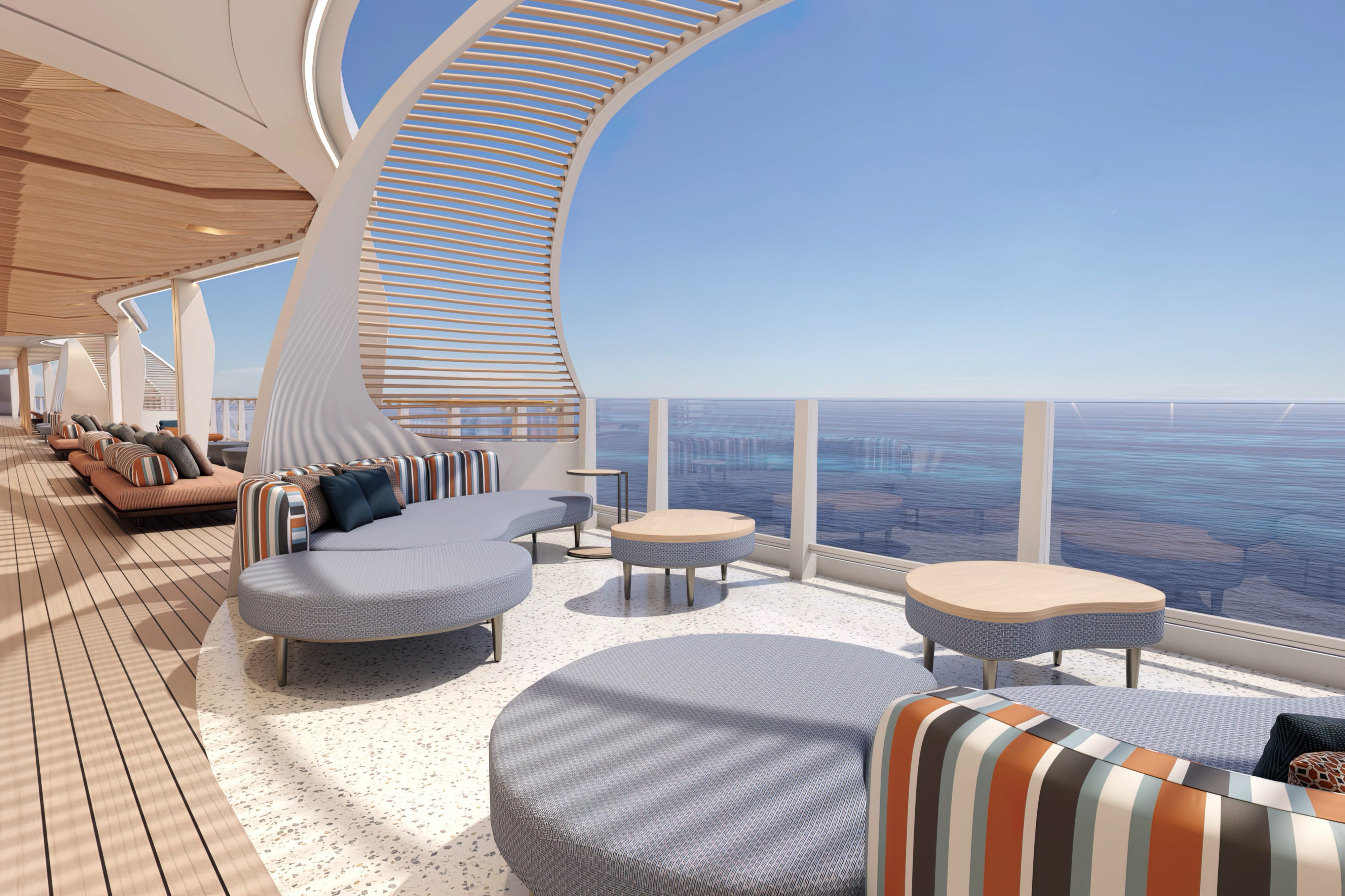 Designed to blend both indoor and outdoor experiences with stunning views of the ocean through grandiose floor-to-ceiling windows for panoramic views from the ship’s bow.