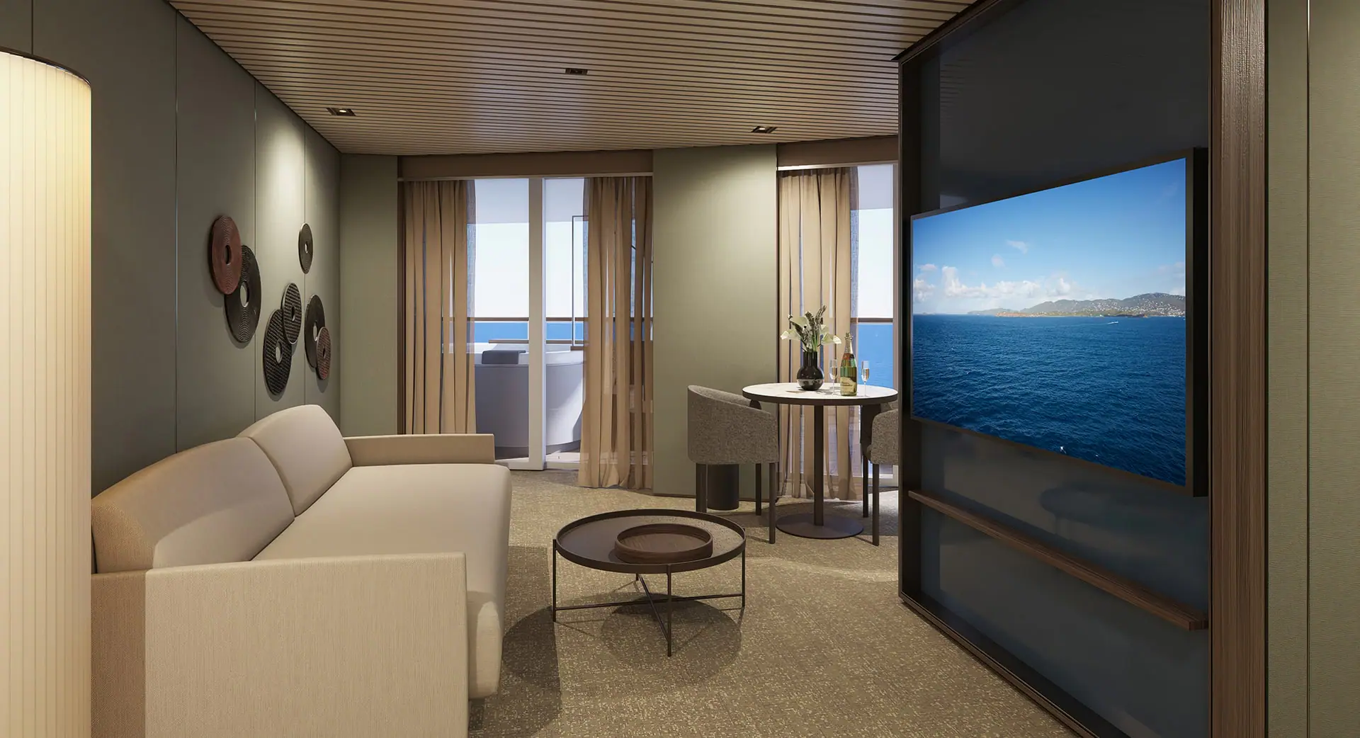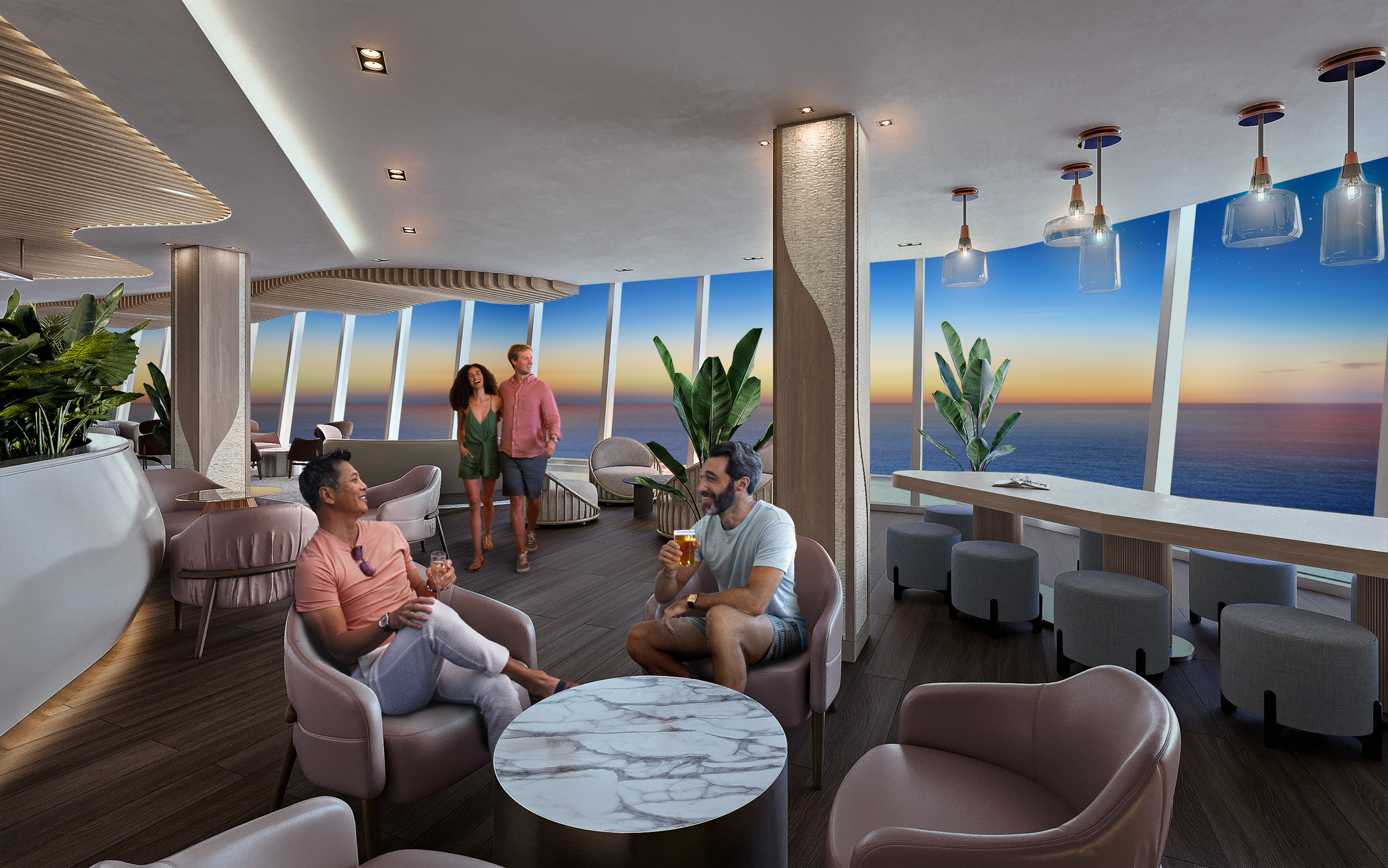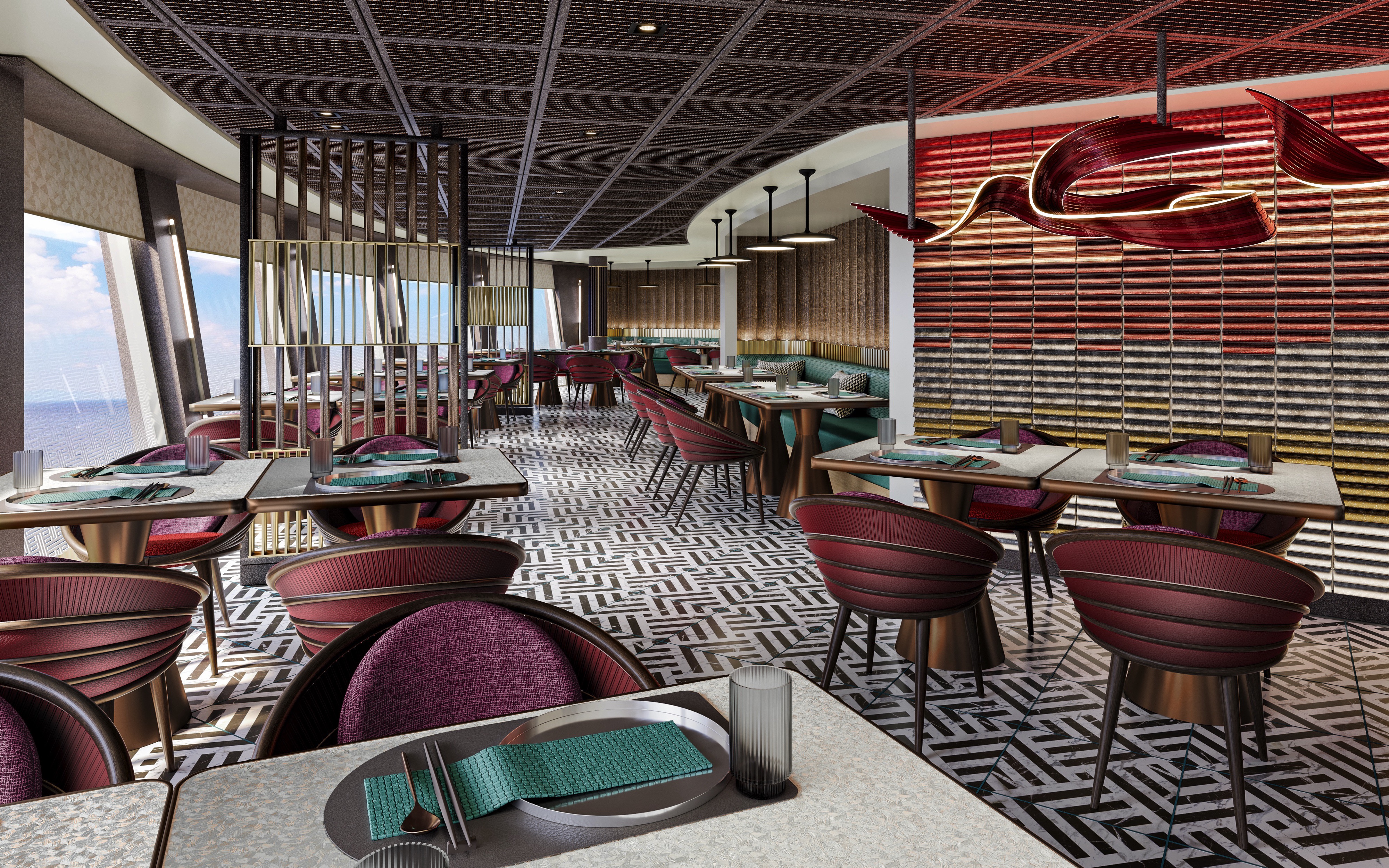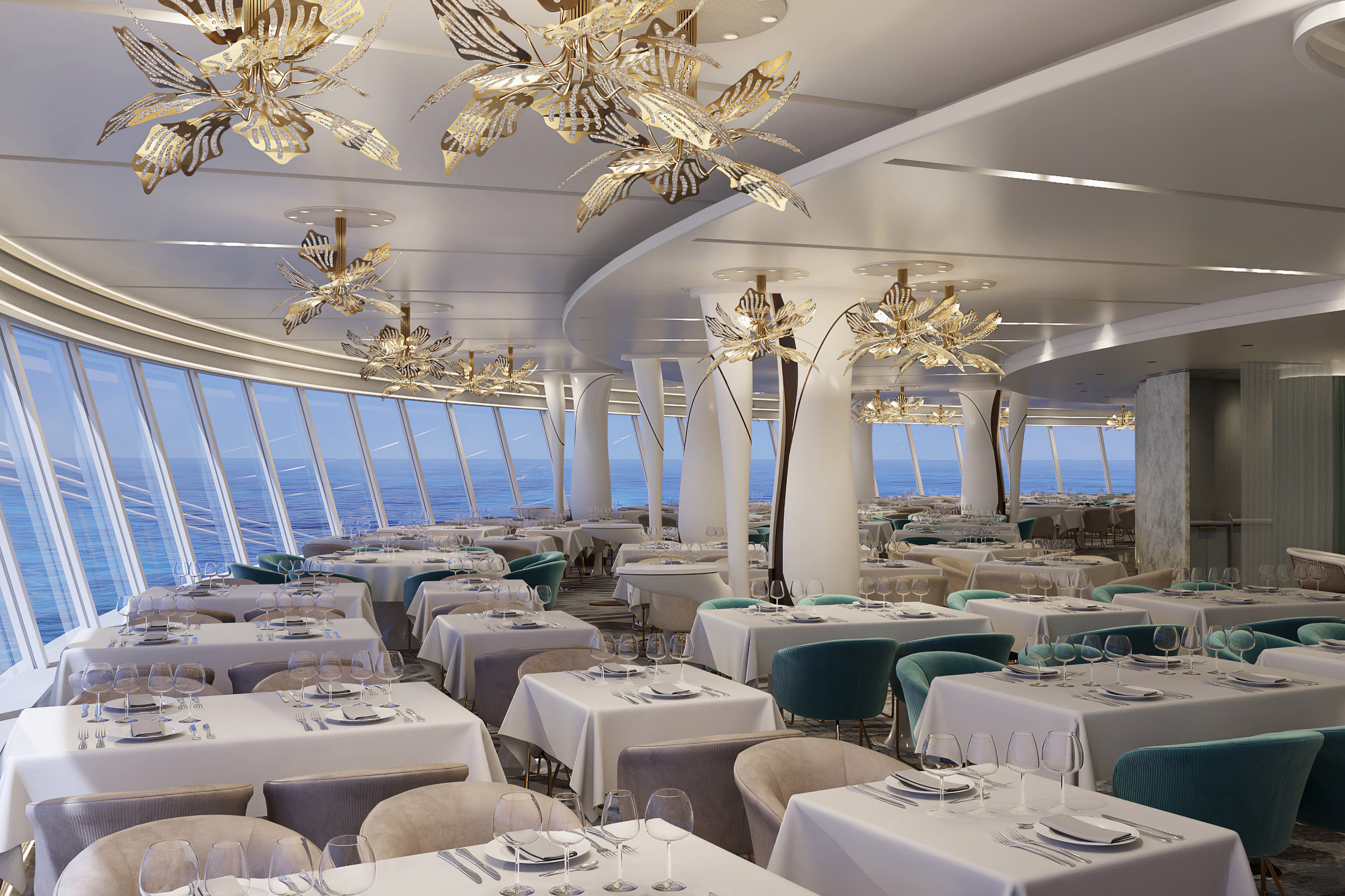 Designed to blend both indoor and outdoor experiences with stunning views of the ocean through grandiose floor-to-ceiling windows for panoramic views from the ship’s bow.