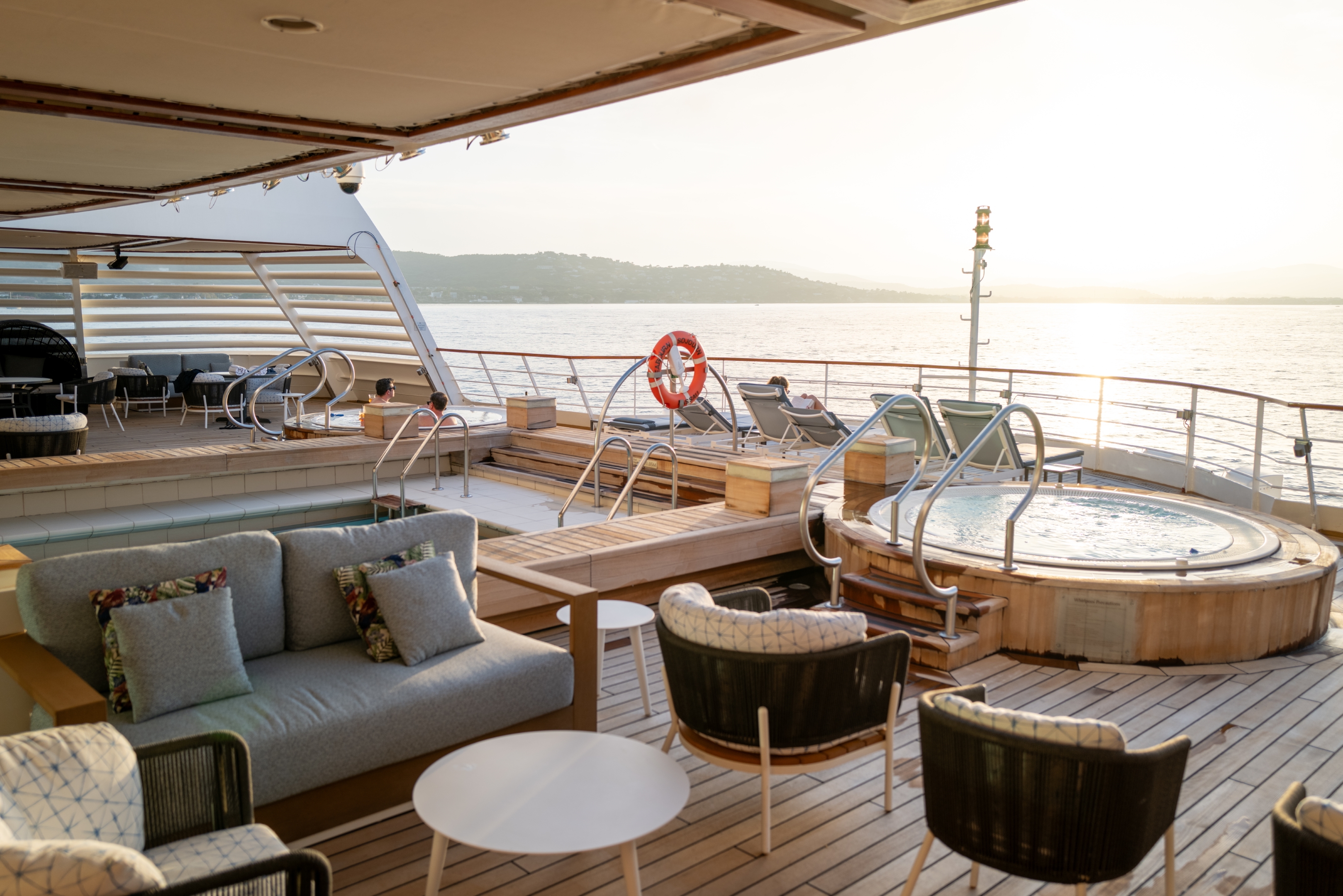 The Retreat is located around a central whirlpool with step-up access to water maintained at an inviting temperature. Up to 28 guests can stretch out on comfortable sun loungers; pull up a bar stool or take a table seat for champagne and cocktails custom created by Seabourn mixologists; or enjoy a selection of bites from a healthy spa menu. A selection of amenities include fresh fruit baskets, premium sun lotions, Evian mist spray, plush towels and personalized bathrobes, while a dedicated Retreat Concierge will be available to satisfy guest requests.