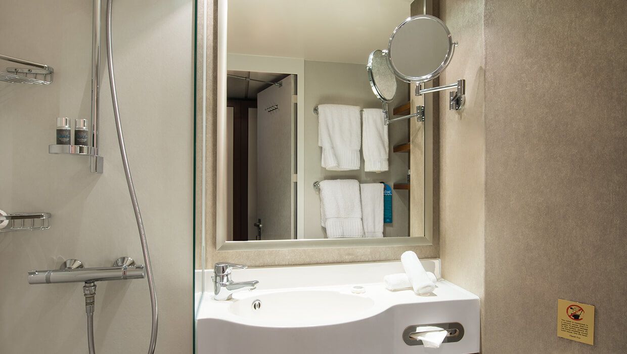With the polished style and stellar service of a Club Interior Stateroom, you'll enjoy our plush cotton robes, slippers upon request, French bath products, and 24-hour room service.