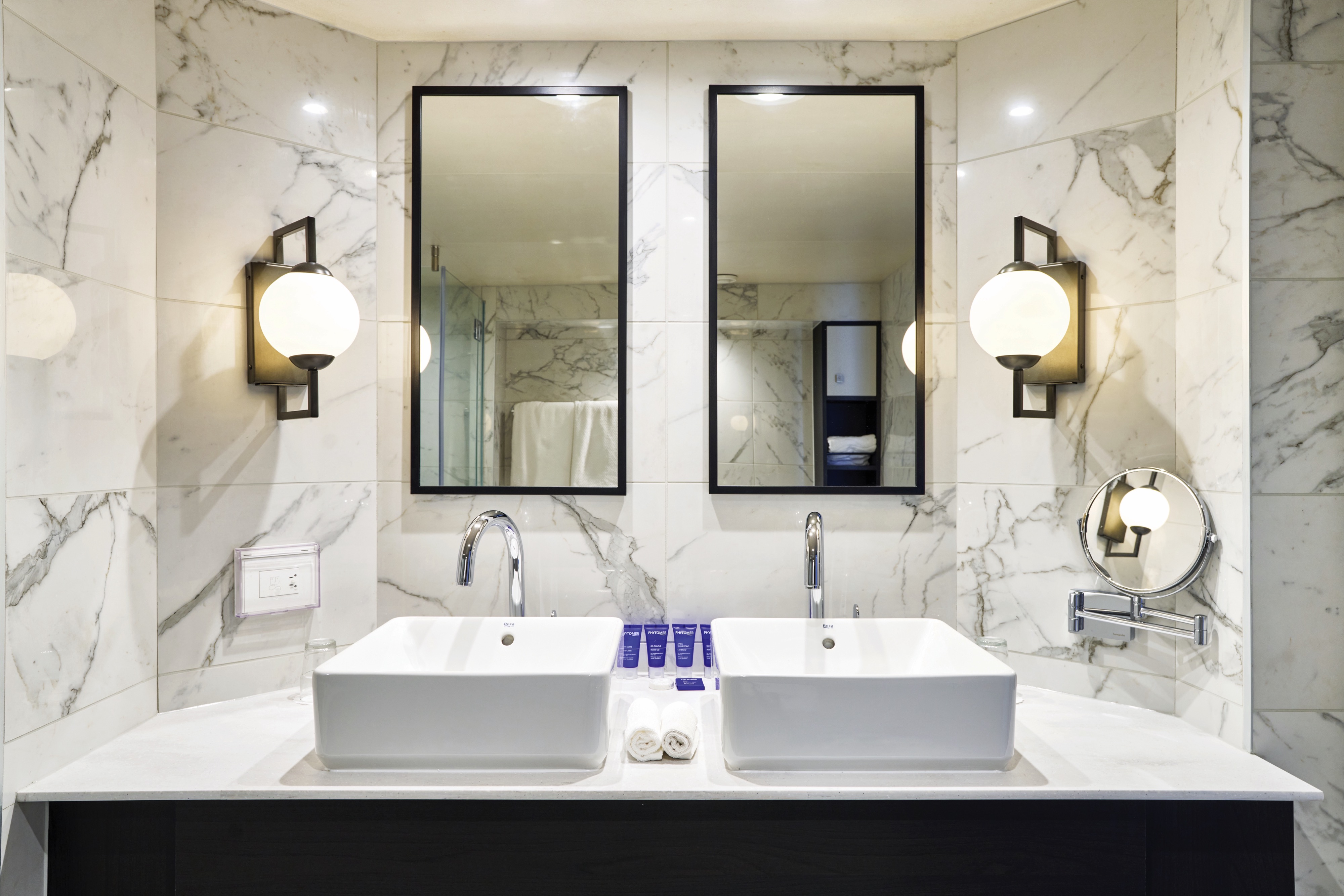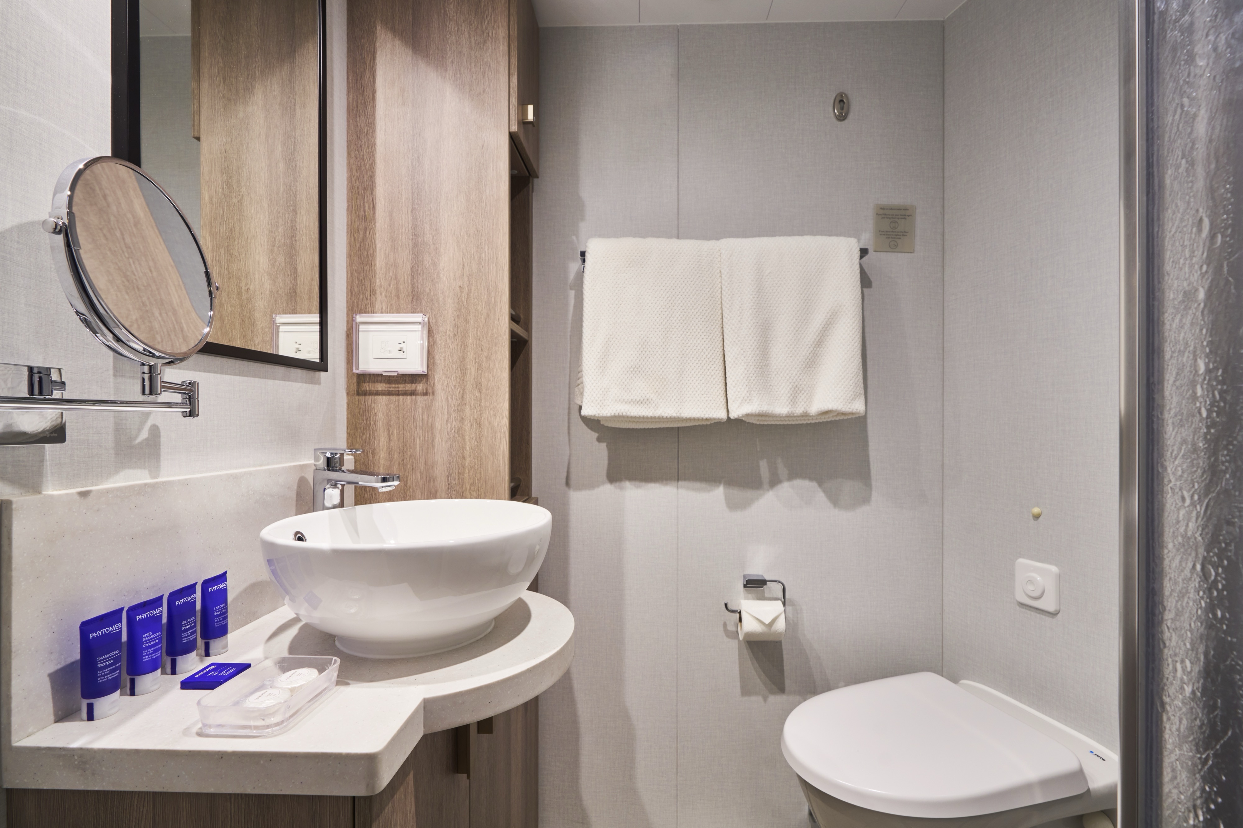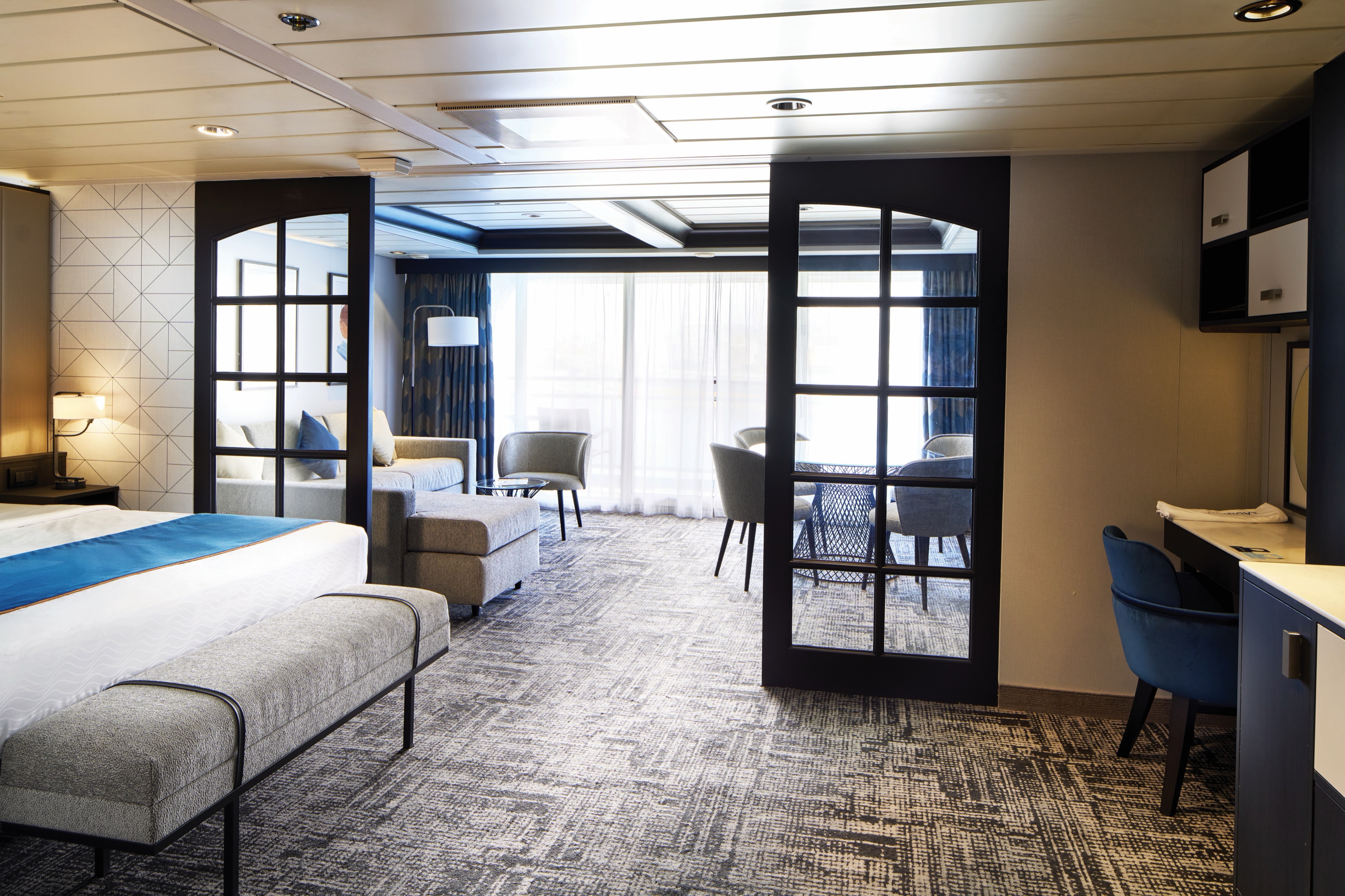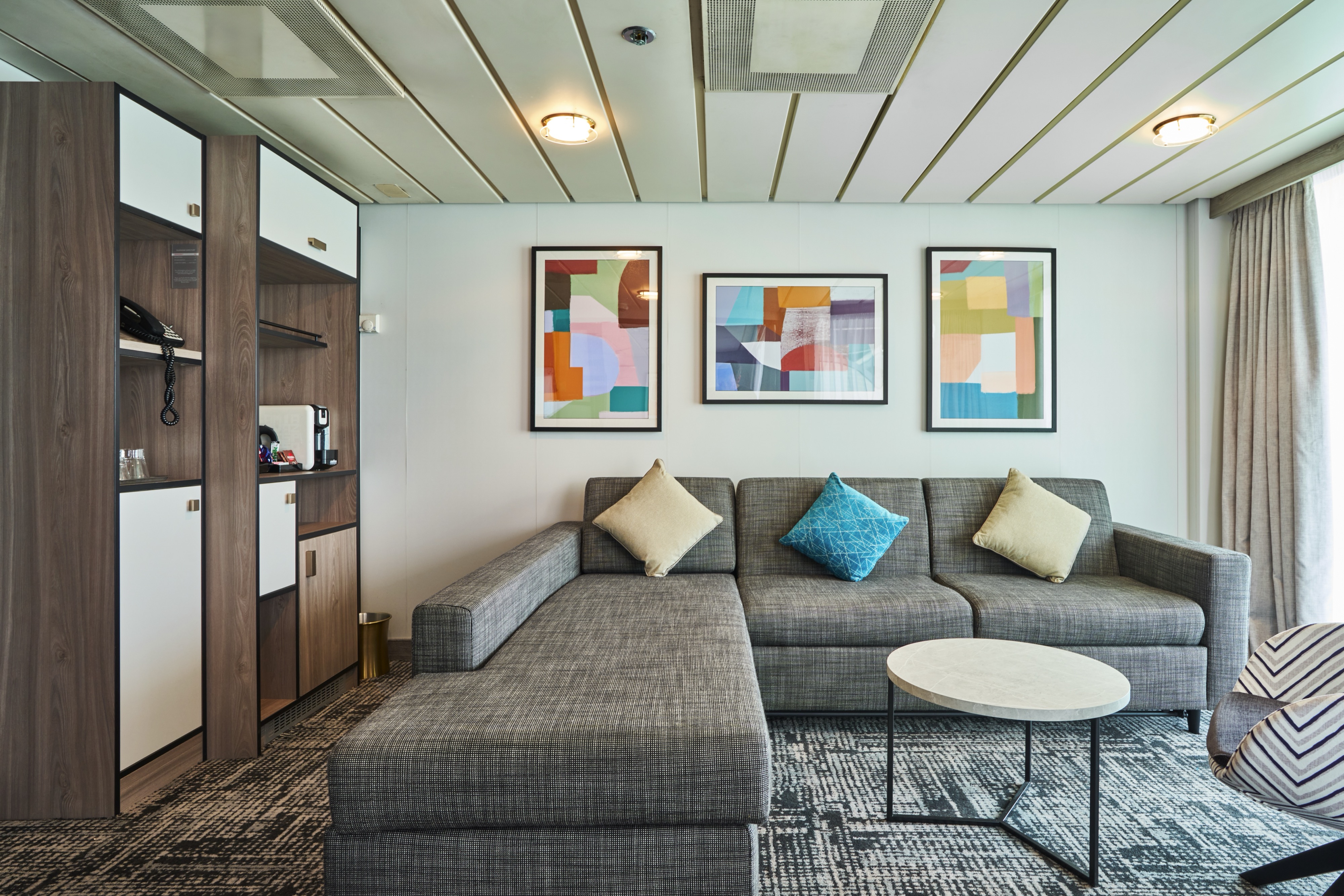 The Grand Suites on Deck 8 got a full refurbishment in Novemeber 2024. They have twin beds that can come together to make a queen-size, and a sitting area with a sofa bed. They can sleep up to four people. You'll get a bathroom with a WC and a walk-in shower, and there's a balcony covering 10.3m² where you can admire the sea views. Inside, Grand Suites measure 32m². When you book a cabin with Suite Service included, you can look forward to one continental breakfast in bed per person per week, and a free pressing service for up to three items during your stay. On top of that, you’ll have a coffee machine, slippers, a dressing gown, upgraded toiletries and a choice of pillows to best fit your comfort needs.
