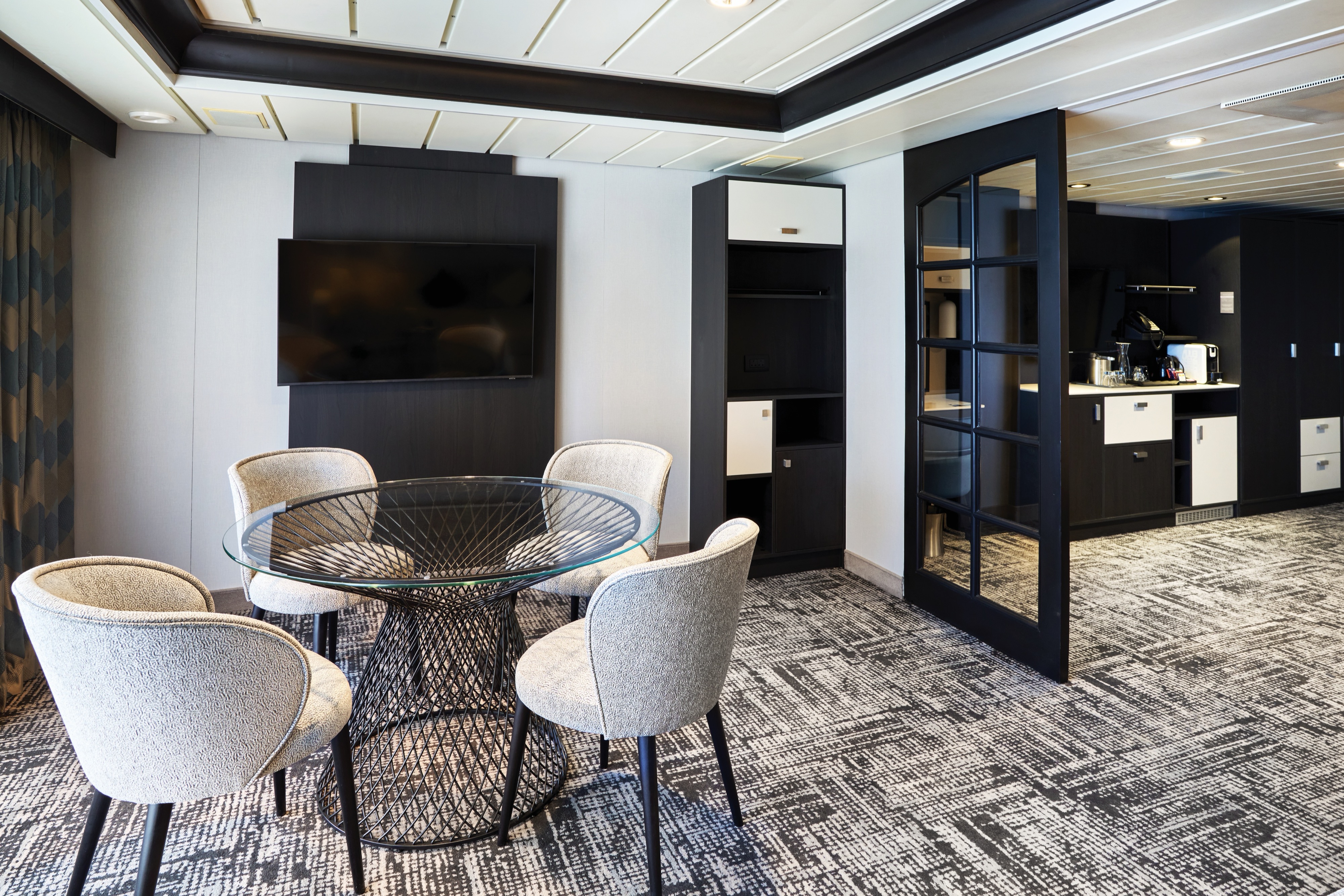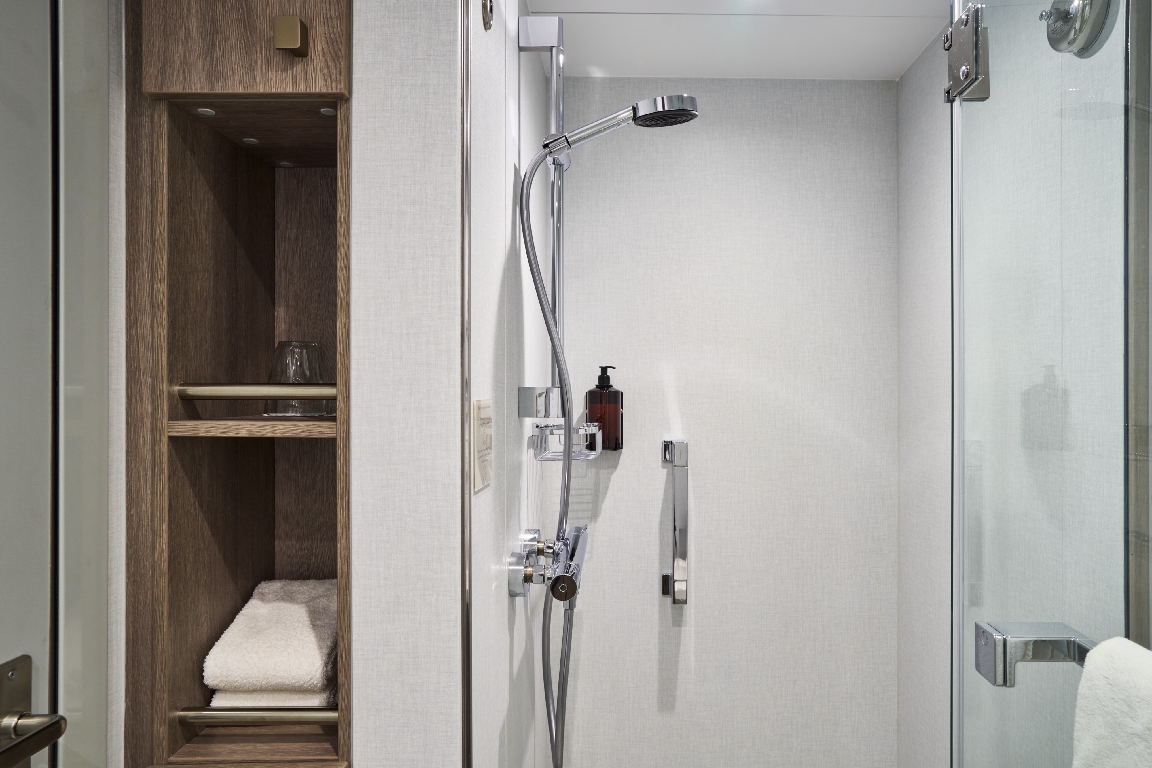 There are five Executive Suites onboard, which got a full refurbishment in November 2024. They sleep up to four, and come with a separate living area with a queen-size sofa bed, a queen-size bed and an en suite with a WC, a shower and a bath. You can soak up sea views from the comfort of your private balcony – it's got glass doors, letting in plenty of light, and it adds 8.8m² to your space. Inside, the cabin covers a big 47m². When you book a cabin with Suite Service included, you can look forward to one continental breakfast in bed per person per week, and a free pressing service for up to three items during your stay. On top of that, you’ll have a coffee machine, slippers, a dressing gown, upgraded toiletries and a choice of pillows to best fit your comfort needs.