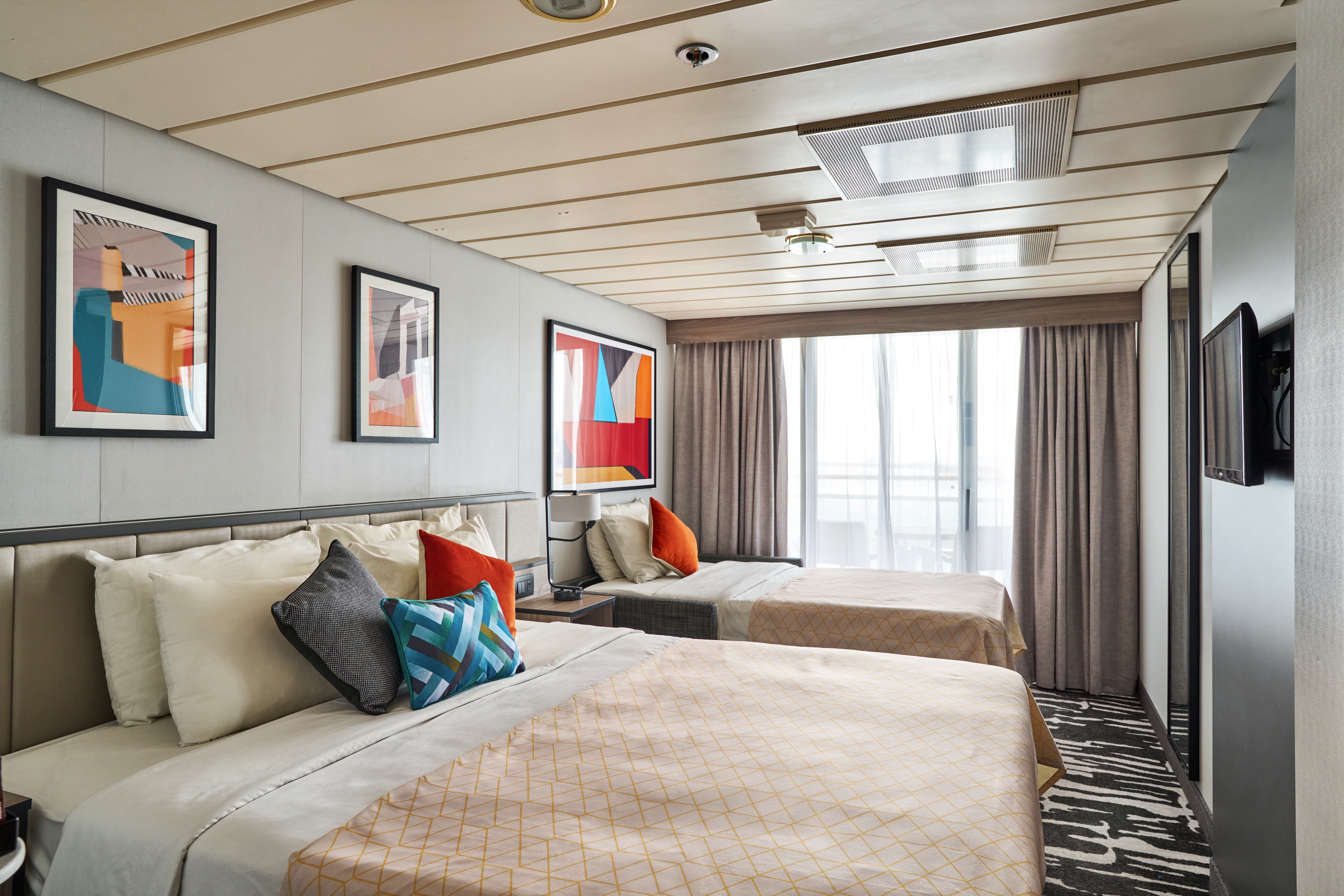 You get a set of twin beds that convert to a queen-size double bed and an en suite with a WC and a shower. You’ll find these cabins on decks 7 and 8, and measure 15m².