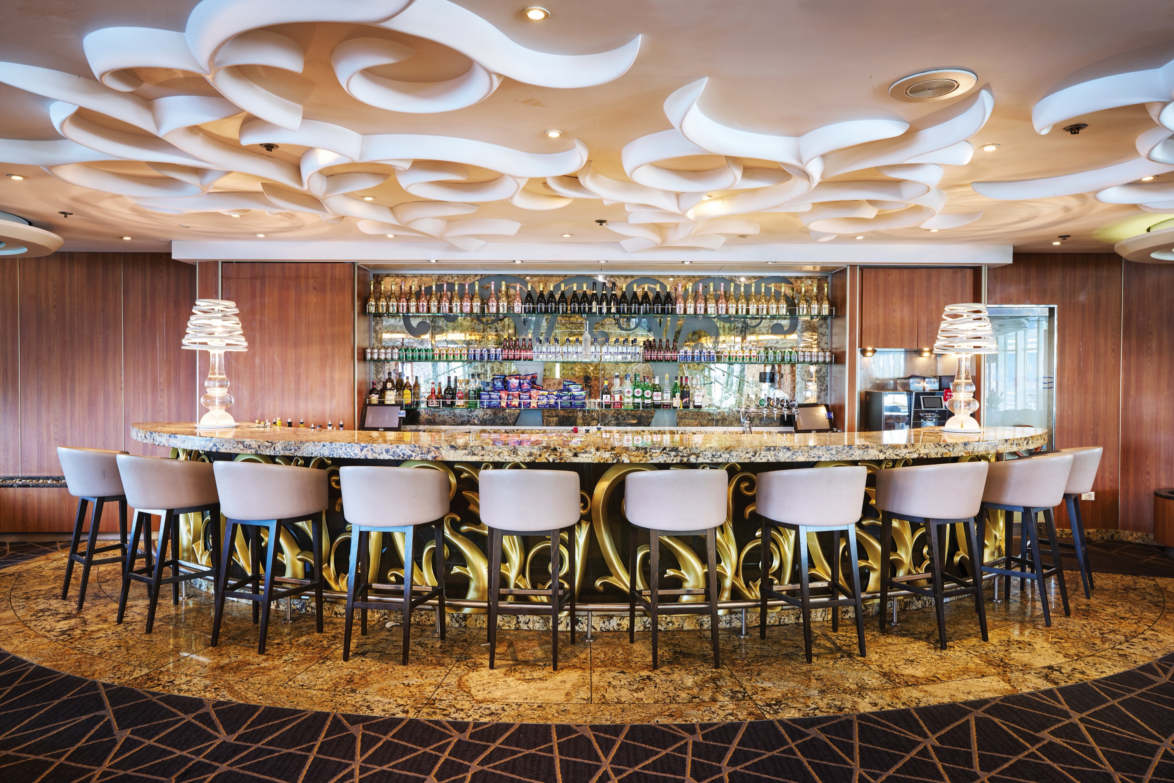 A position on the highest point on deck 11 - where the bar gets its name from - means that drinks in this lounge come with the ship's best sea views. It's a contemporary cocktail bar by evening, transforming into a late-night disco as the hours pass.