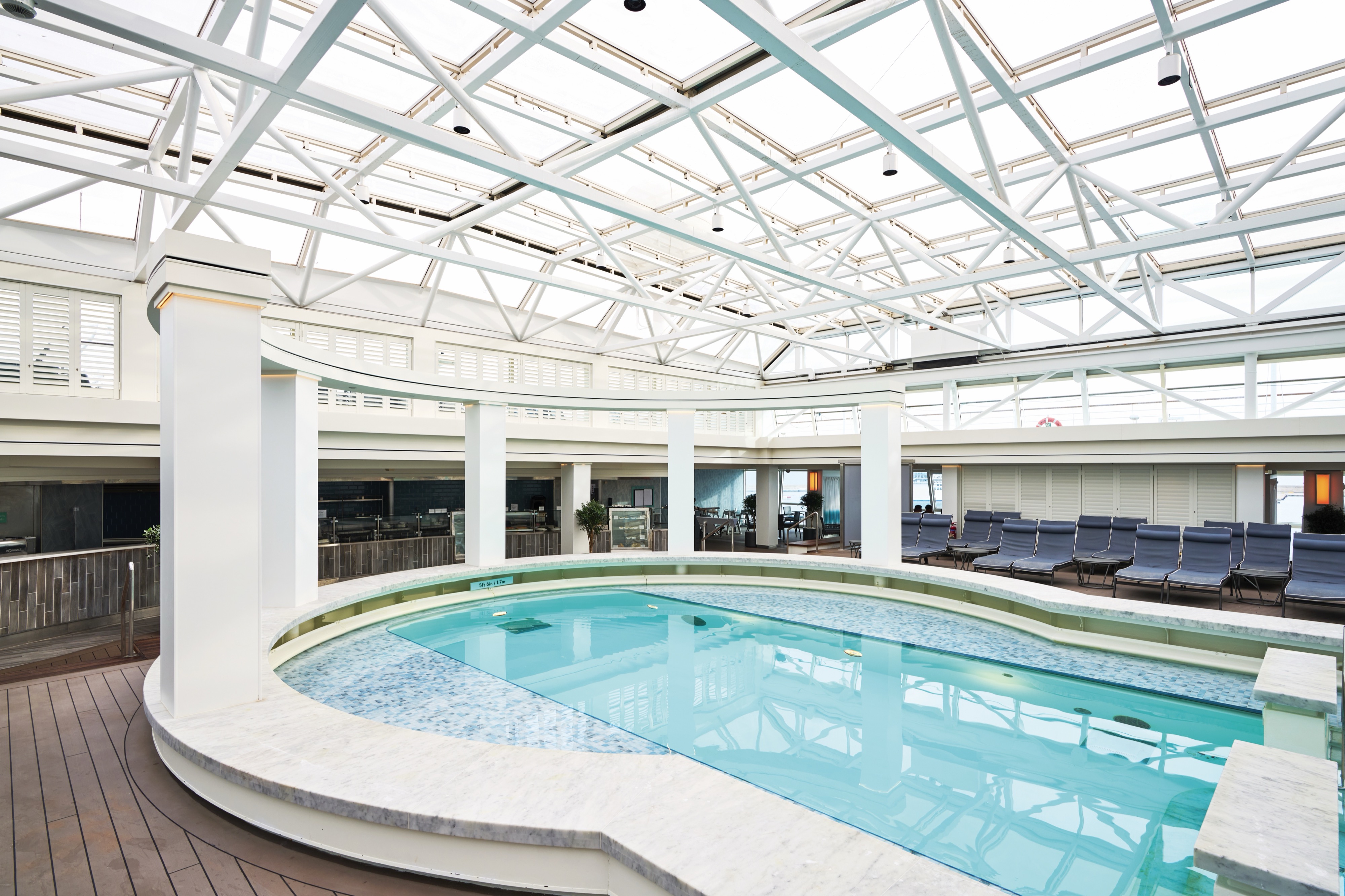 Marella Discovery 2’s indoor pool comes with a huge glass canopy roof, and rows of comfortable loungers.