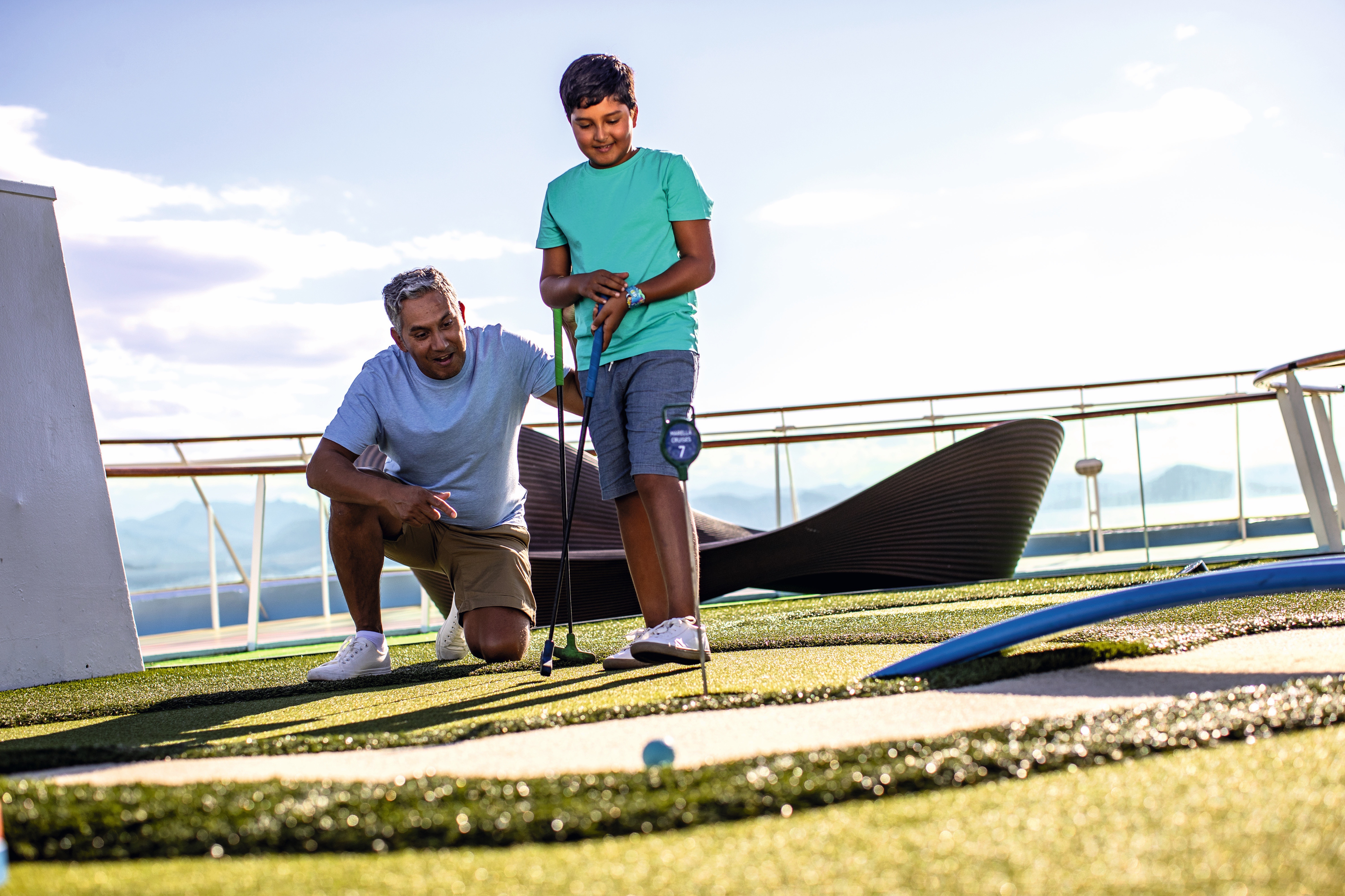 Chilled-out days onboard are spent getting pampered at the spa or lounging by one of the two pools – both come with built-in whirlpools, too. For something more active, you can aim for a hole in one on the minigolf course or reach for the sky on the rock climbing wall.